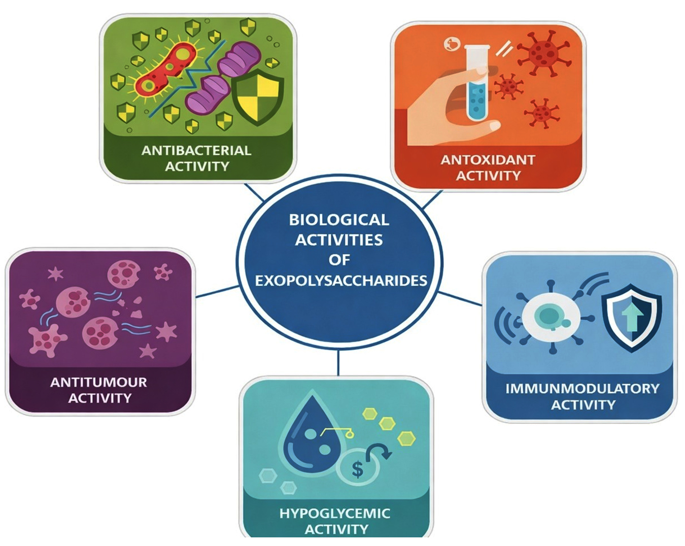 Microorganisms such as bacteria, actinomycetes, yeasts, moulds, and viruses are prolific producers of exopolysaccharides (EPS) among which bacteria are the most abundant in nature and account for 90%-95% of microorganisms. Their capacity for extreme adaptation has made them the most successful organisms on Earth despite several harsh environmental conditions. During their period of growth, they produce several biologically active compounds. Exopolysaccharide, or EPS, is one such bioactive compound. EPS can be defined as polymers with high molecular weights released into the environment by microorganisms. It was Sutherland who first described exopolysaccharides as high molecular weight carbohydrate polymers that are produced by marine bacteria. The exopolysaccharides are produced in bacteria either intracellularly or extracellularly. EPS are composed of sugar residues, which can be seen as a capsule or slime layer without any association with the host cell. EPS is also discovered to be extremely important in immune-stimulatory functions anticancer functions and blood cholesterol-lowering effects.1-8 EPS produced by bacteria consists of several functional groups including hydroxyl, carbonyl, acetate etc. This enables modification in EPS and new properties can be imparted to EPS.9 Bacterial EPS has a variety of biological roles. They protect cells against extreme temperature, salinity, aridity, UV-rays, unfavourable pH levels, phagocytosis, osmotic stress, and chemical agents (oxidants, heavy metals, and antibiotics).10-14 Polysaccharides are secreted by the majority of marine bacteria and aid in their survival.10 The cryoprotective effect was found in Arctic bacteria.11 The bioethanol-producing bacteria Zymomonas mobilis can flourish in conditions with up to 16% alcohol, and their released EPS also exhibits this biological activity. EPS is the primary component of the biofilm matrix in both Gram-positive and Gram-negative bacteria, and it is crucial for bacterial adhesion, aggregation, and biofilm formation.15-17 Extracellular polymeric substances constitute the biofilm matrix and aid in promote horizontal gene transfer, prevent bacteria from drying out, and provide protection against external agents like antibiotics.