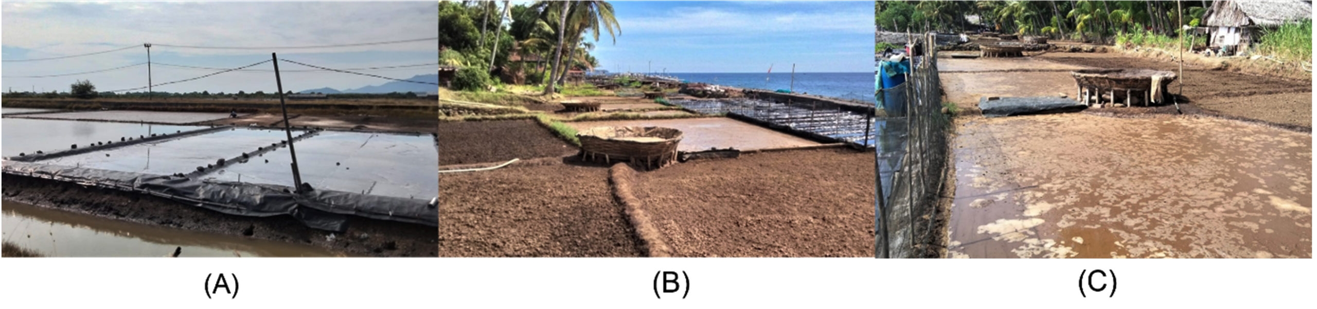 Figure 1. Traditional salt ponds in Buleleng Regency, Bali Province, Indonesia. (A) Salt pond in Pejarakan Village, (B) Salt pond in Les Village, (C) Salt pond in Tedjakula Village
