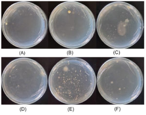 Figure 2. Bacteria colonies cultured on MM63 agar media supplemented with 5% (w/v) NaCl. The colonies were isolated from: (A) saltwater and (B) soil samples collected from Pejarakan Village Salt Pond; (C) saltwater and (D) soil samples collected from Les Village Salt Pond; and (E) saltwater and (F) soil samples collected from Tedjakula Village Salt Pond