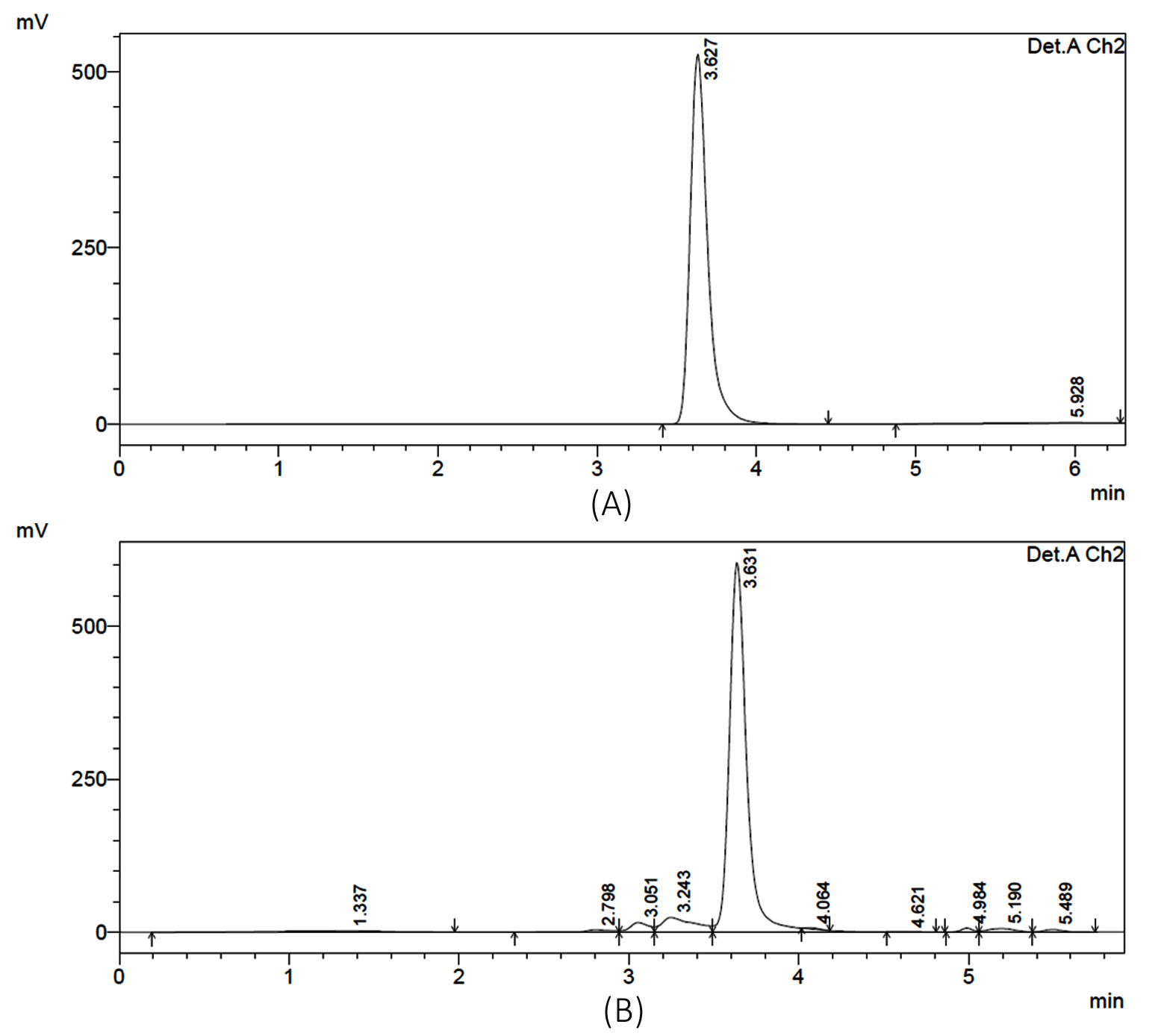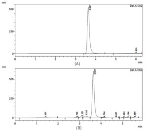 Figure 3. HPLC chromatograms of ectoine. (A) ectoine standard, (B) ectoine extracted from the halophilic bacteria culture