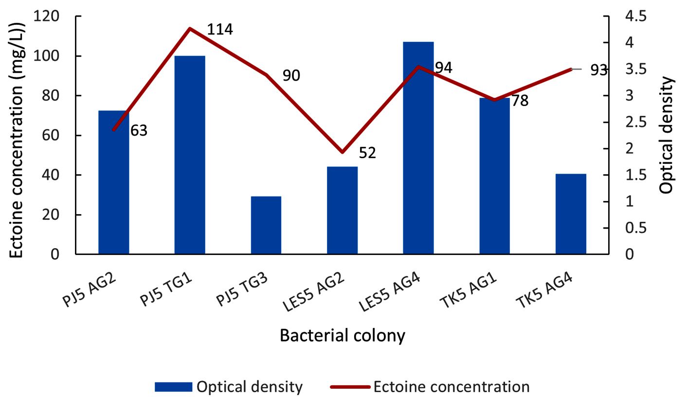 All seven isolates showed ectoine production, with concentrations ranging from 52 to 114 mg/L (Figure 4). Two isolates, LES5 AG2 and PJ5 AG2, showed the lowest ectoine yields, at 52 mg/L and 63 mg/L, respectively. Four other isolates produced ectoine at moderate levels, including TK5 AG1 (78 mg/L), PJ5 TG3 (90 mg/L), TK5 AG4 (93 mg/L), and LES5 AG4 (94 mg/L). The highest ectoine concentration was produced by isolate PJ5 TG1, which yielded 114 mg/L. Bacteria growth, measured by OD at 600 nm, did not correlate directly with ectoine production levels. Specifically, isolates with high growth rates, such as PJ5 AG2, LES5 AG4, and TK5 AG1, produced relatively low levels of ectoine. Conversely, isolates PJ5 TG3 and TK5 AG4 were remarkable for producing high levels of ectoine despite having comparatively low growth rates. This suggests that the strains possess efficient ectoine biosynthetic pathways, but the overall productivity could be enhanced by optimizing conditions to increase biomass production.