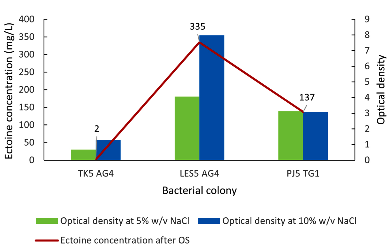 The ectoine productivity of the three highest-producing bacteria isolates, namely PJ5 TG1, LES5 AG4, and TK5 AG4, was further investigated using a two-stage cultivation method with osmotic shock (OS). This method comprised an initial growth phase in media with a low NaCl concentration to maximize cell biomass, followed by a transfer to media with a higher NaCl concentration to induce ectoine production. Osmotic shock conditions were tested by shifting the NaCl concentration from 5%-10% (w/v). The treatments were performed without replication.