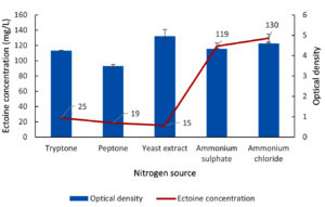 Figure 7. Impact of various nitrogen sources on the growth (OD) and ectoine concentration produced by the halophilic bacteria isolate LES5 AG4