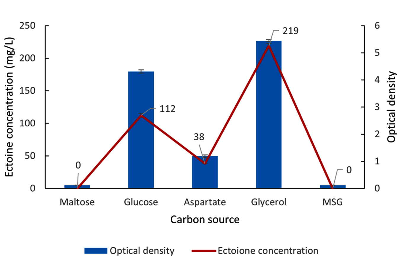 Figure 8 shows the bacteria growth and ectoine concentration produced by the LES5 AG4 isolate across the tested carbon sources. The bacteria showed no observable growth in the MM63 medium when supplied with maltose or MSG as the sole carbon source, resulting in zero ectoine production. L-aspartate proved to be an inefficient carbon source for both bacteria proliferation and ectoine biosynthesis. Specifically, growth was minimal (OD of 1.2), yielding an ectoine concentration of only 38 mg/L. Glucose, on the other hand, supported a substantially higher ectoine yield of 112 mg/L, correlating with a high growth rate (OD of 4.3). Most importantly, glycerol facilitated the highest ectoine concentration recorded at 219 mg/L, accompanied by the maximum observed growth rate (OD of 5.4). These results conclusively show that glycerol is the superior carbon source for both maximizing cell growth and enhancing ectoine production in the LES5 AG4 isolate.