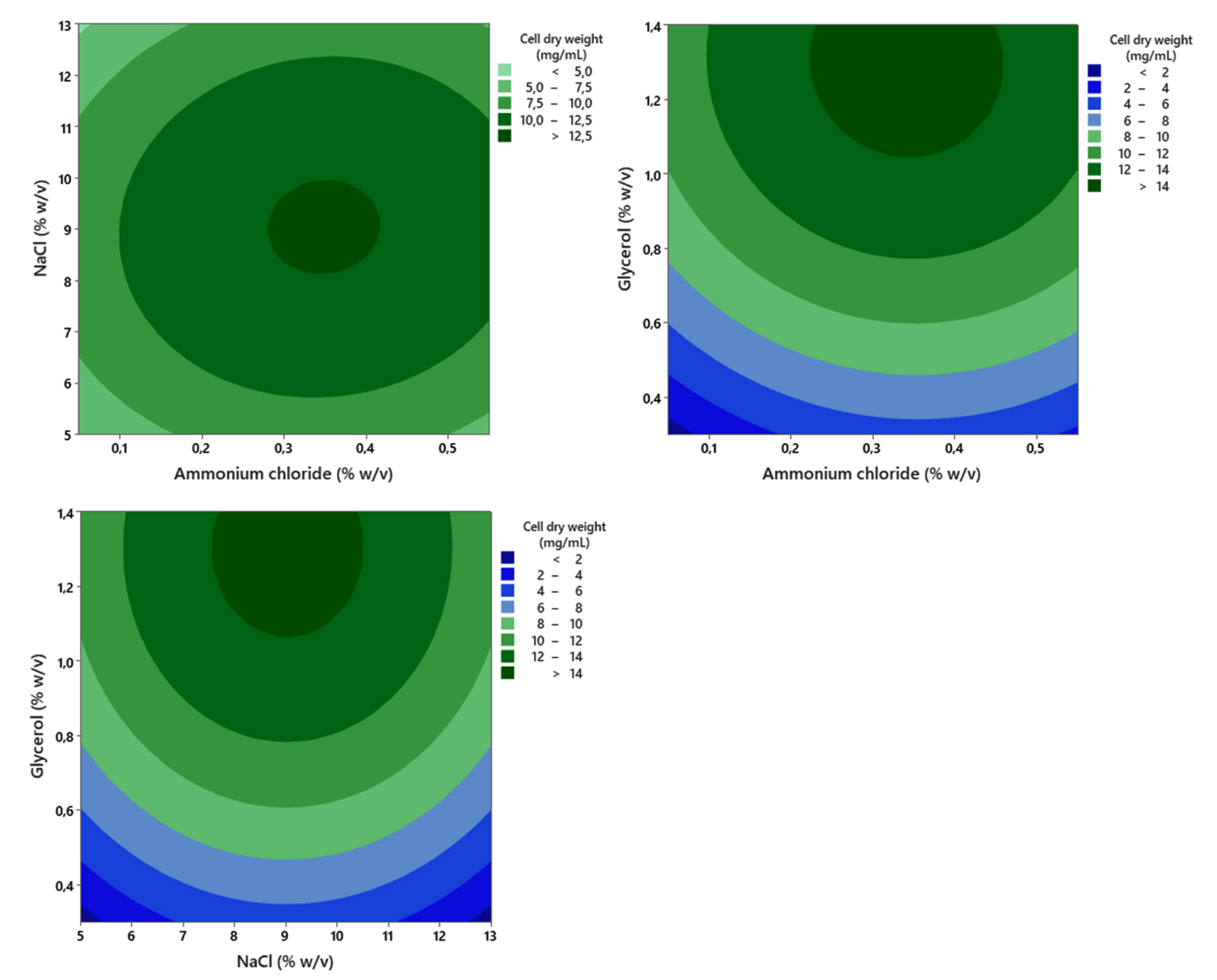 Figure 9. Contour plot showing the combined effect of ammonium chloride, glycerol, and NaCl concentration on the growth (CDW) of the halophilic bacteria isolate LES5 AG4