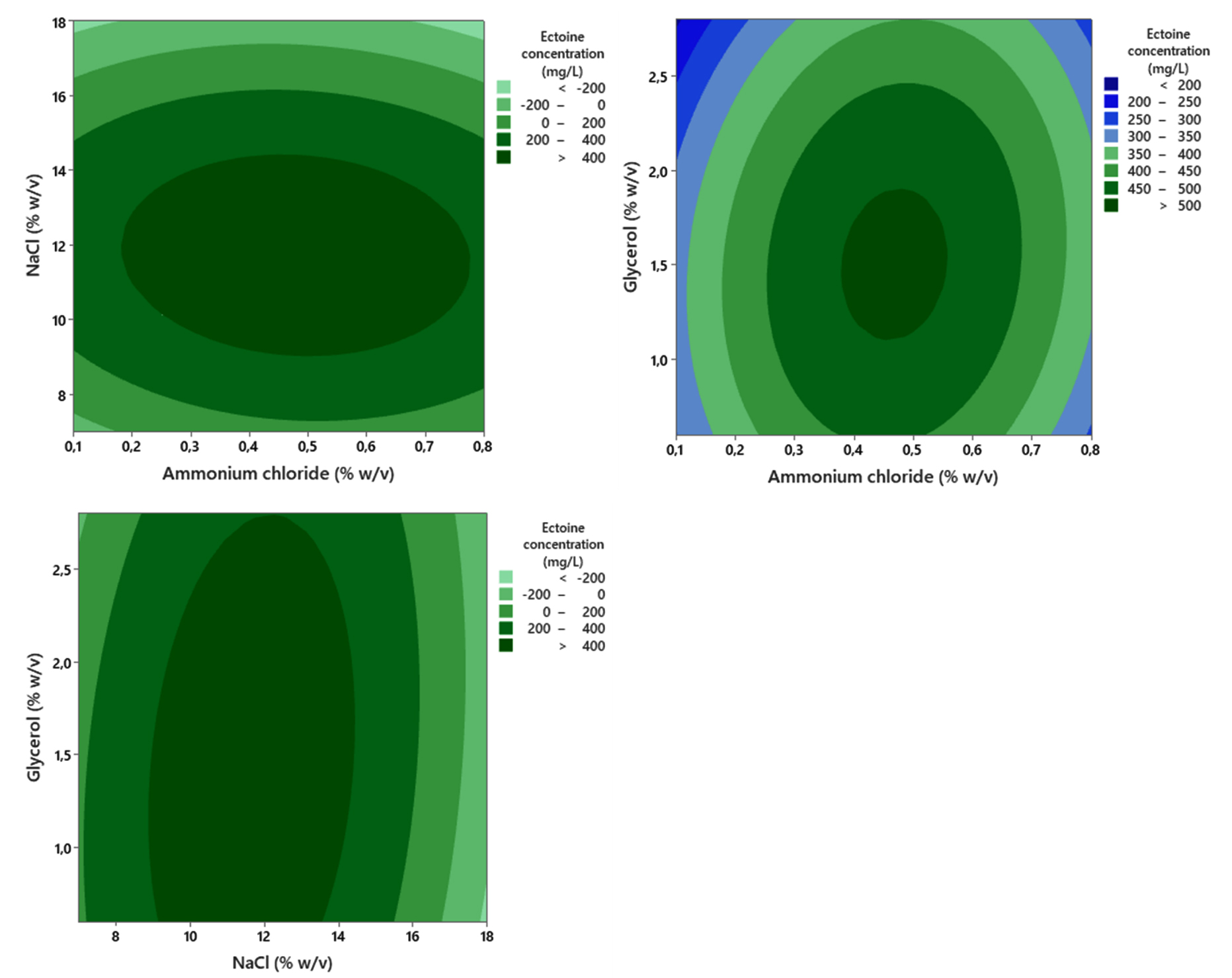 Figure 10. Contour plot showing the combined effect of ammonium chloride, glycerol, and NaCl concentration on the ectoine concentration produced by the halophilic bacteria isolate LES5 AG4