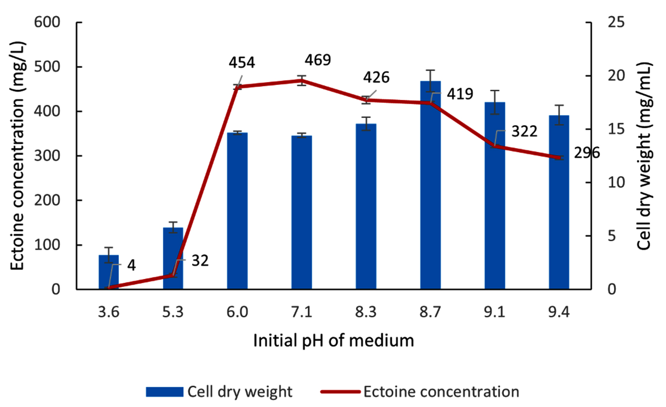 Figure 11. Impact of initial medium pH on the growth (CDW) and ectoine concentration produced by the halophilic bacteria isolate LES5 AG4