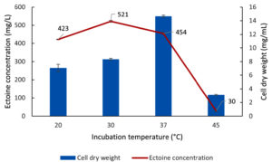 Figure 12. Impact of incubation temperature on the growth (CDW) and ectoine concentration produced by the halophilic bacteria isolate LES5 AG4