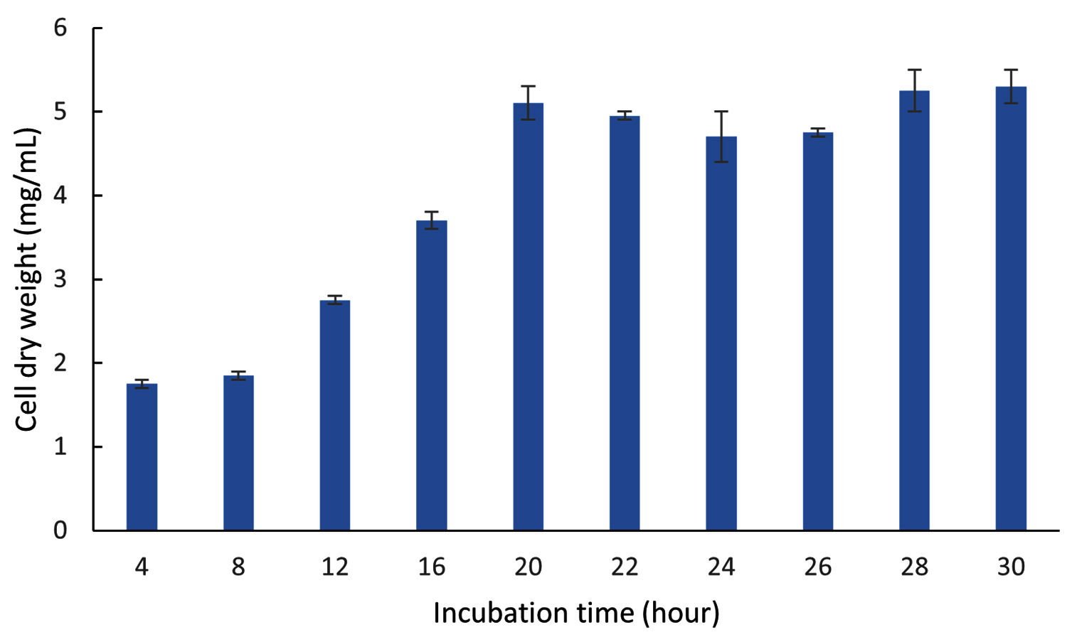 Optimization of the incubation time was performed for two stages, namely Cultivation I for biomass production and II for ectoine production. Figure 13 shows the biomass production (CDW) of the LES5 AG4 bacteria during Cultivation I over an incubation period ranging from 4-30 hours. During the initial incubation period (4 and 8 hours), the bacteria showed low growth, with CDW values of 1.8 mg/mL and 1.9 mg/mL, respectively. Increasing the incubation time led to a significant enhancement in bacteria growth, which peaked at 5.1 mg/mL after incubation for 20 hours. Bacteria growth was then stable between incubation times of 20 and 30 hours, showing the onset of the stationary phase. Based on these results, an incubation time of 20 hours is deemed suitable to achieve optimal biomass for transition to Cultivation II. Although a 30-hour incubation yielded a marginally higher CDW (5.3 mg/mL), at this point, the cells have been established in the stationary phase. Prolonged duration in the stationary phase can result in an accumulation of aged bacteria cells and potentially inhibitory secondary metabolites, which may negatively impact subsequent ectoine production and overall cellular metabolism.