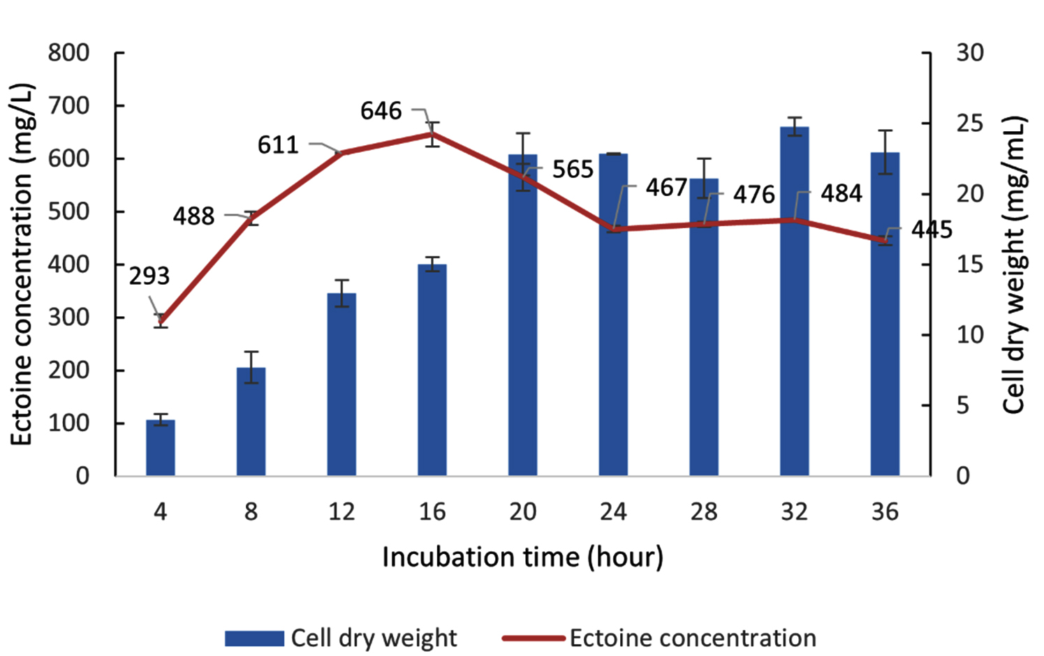 The ectoine yield at 16 hours (646 mg/L) was demonstrably greater than the yield at 20 hours (565 mg/L). Incubation beyond 16 hours led to a significant reduction in ectoine levels, dropping to 467 mg/L by the 24th hour, before stabilizing until the 36th hour. This observation reinforces the principle that the maximum yield of a secondary metabolite (ectoine) often occurs during the late exponential or early stationary phase of growth and is not necessarily correlated with the point of maximum biomass accumulation.