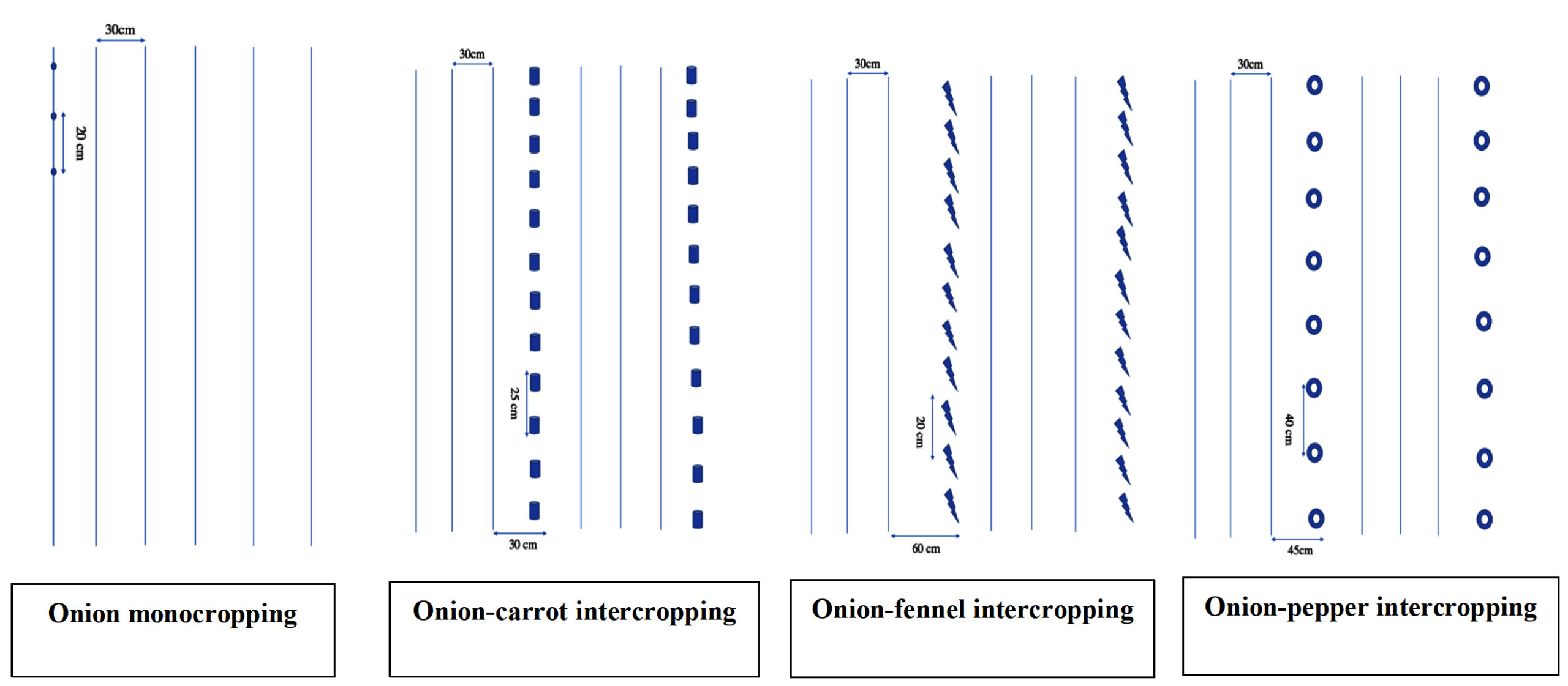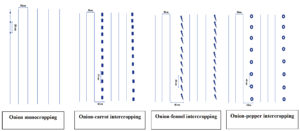 Figure 1. Schematic representation of the different cropping systems used in the field experiment: onion monocropping (20 x 30 cm), onion-carrot (25 x 30 cm), onion-fennel (20 x 60 cm) and onion-pepper (40 x 45 cm). Each intercropping system followed a 3:1 ratio (three rows of onion to one row of intercrop)