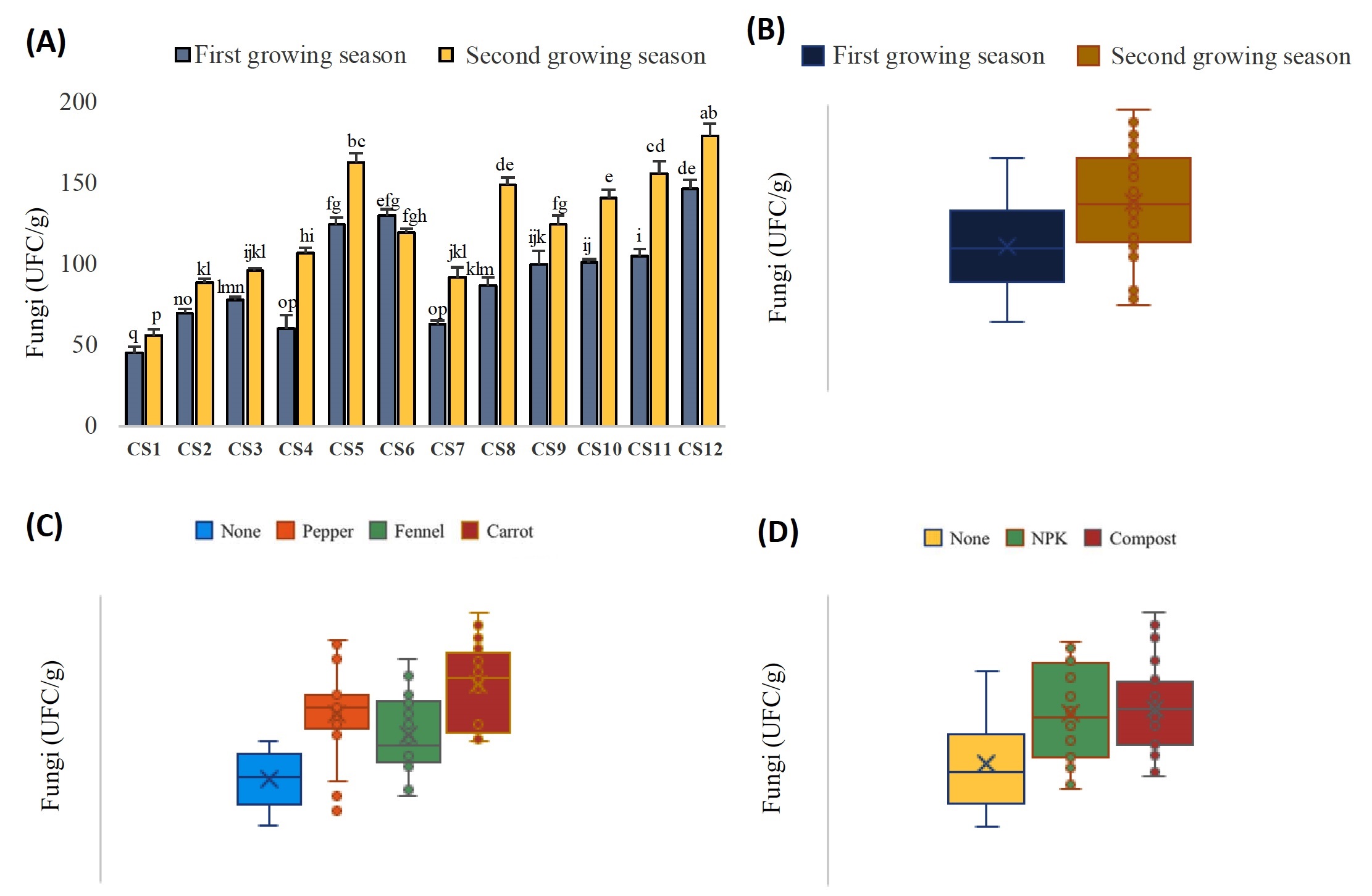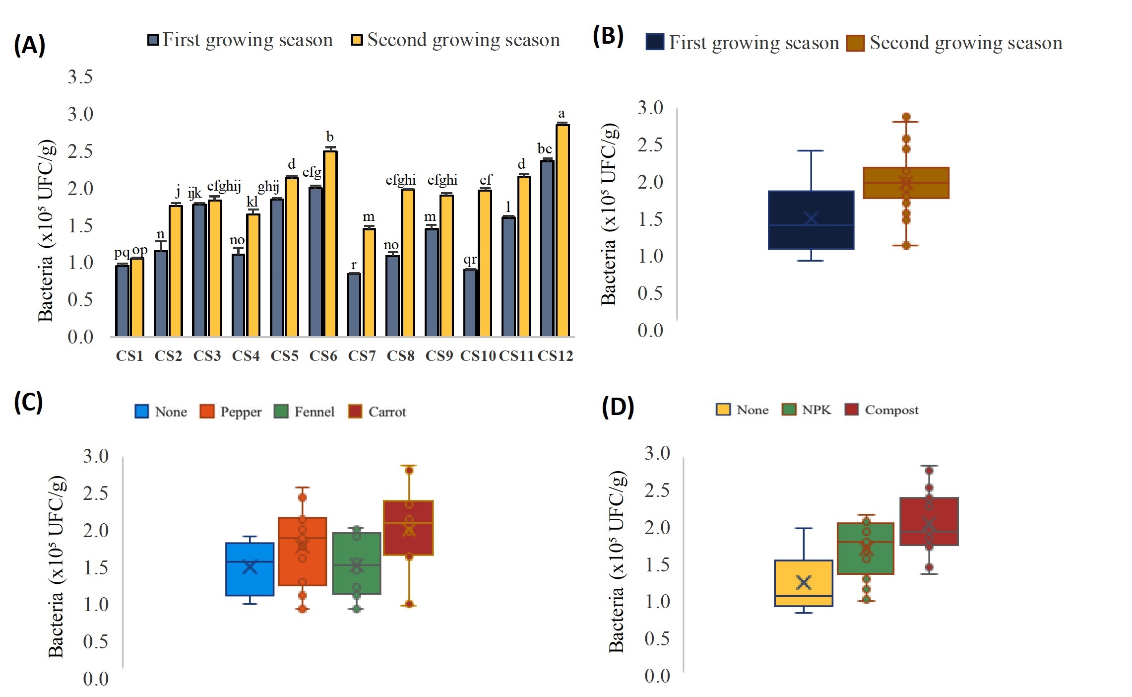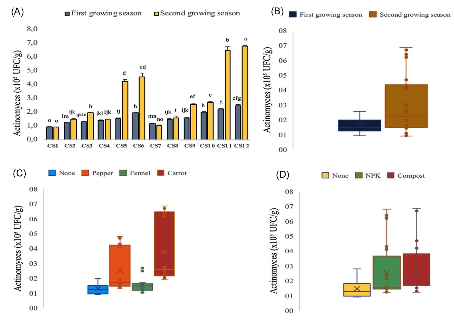 However previous studies have primarily focused on the effects of either organic amendments or intercropping systems as single factors on soil microbial dynamics.43-45 For instance, compost has been shown to improve microbial activity and carbon sequestration, while intercropping has been linked to increased microbial diversity and root-microbe interactions.36,46 However, research addressing the synergistic impact of combining organic fertilization with intercropping, particularly in onion-based systems, remains scarce. The main objective of this study is to assess the effects of onion intercropping with pepper (Capsicum annuum), fennel (Foeniculum vulgare) and carrot (Daucus carota), combined with either organic (compost) or chemical (NPK) fertilization on soil microbial biomass carbon and the densities of bacteria, fungi, and actinomycetes. The study also aims to evaluate how these agroecological strategies affect onion yield, in order to identify productive and biologically enriched cropping systems that enhance soil fertility and promote sustainable vegetable production.