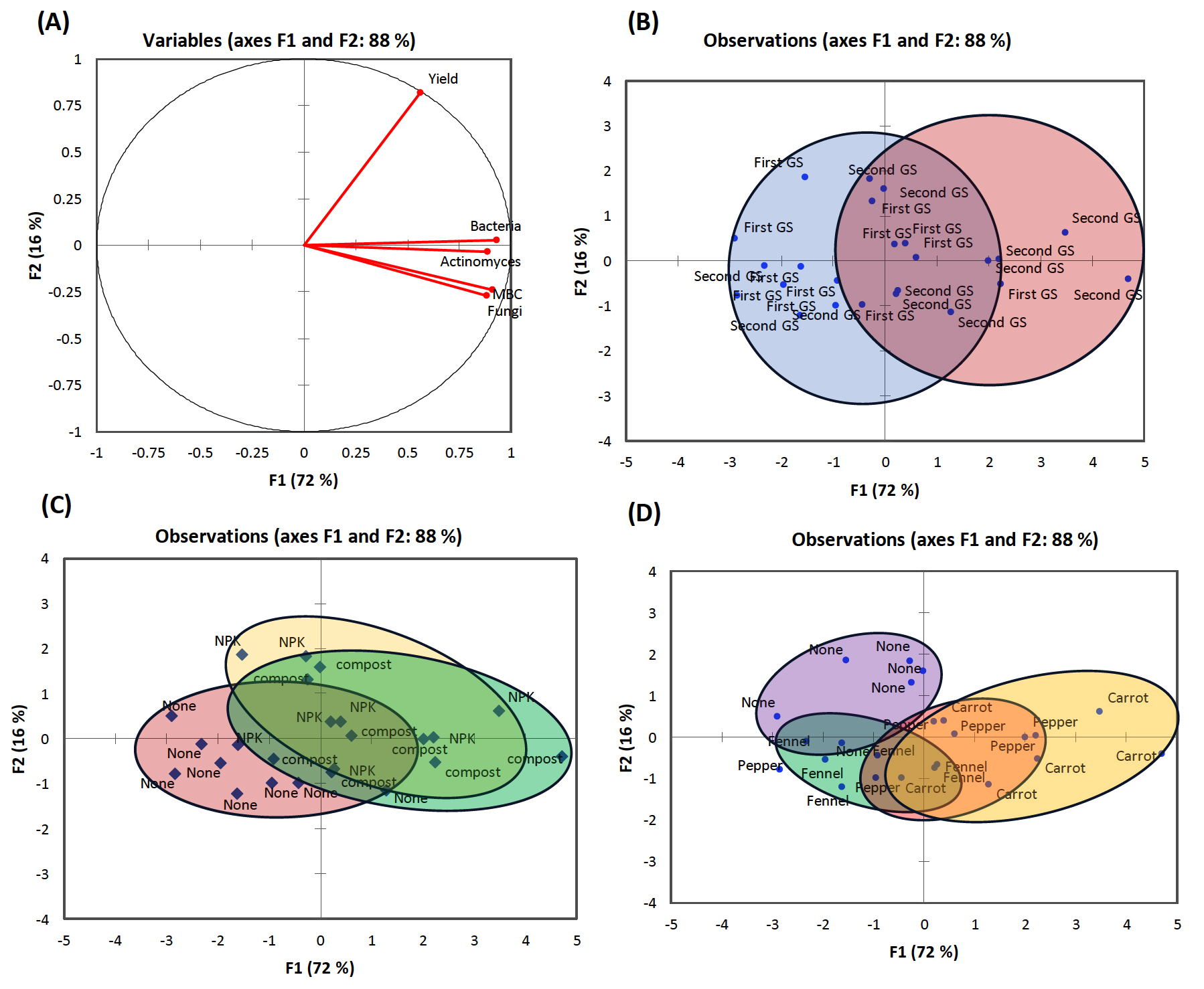 The analysis of variance (ANOVA) was used in the study to diagnose the effect of factors separately and in combination on soil traits.53 Pearson’s correlation test was carried out to investigate the possible associations between yield and microbiological traits.54 Principal component analysis (PCA) was used as a multivariate test in the aim of evaluating relationships between soil traits and treatments.55 All tests made in the study were carried out using XLStat software.