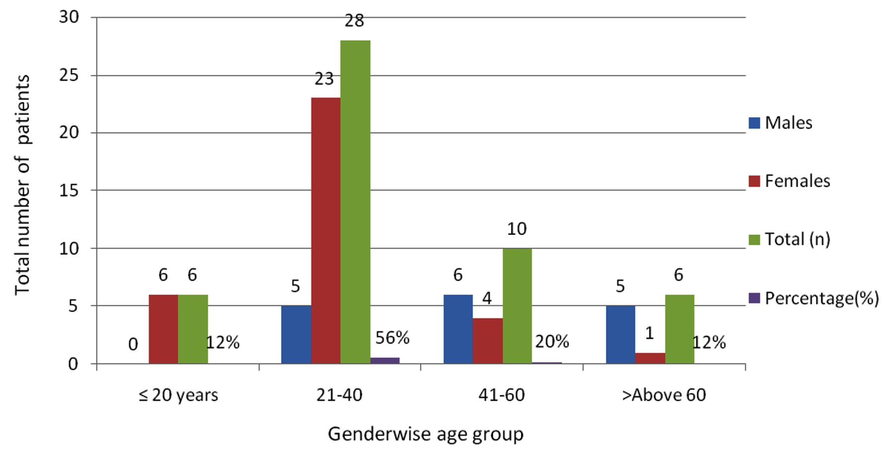 Fifty culture-positive SSI cases were recorded over the course of study period. The 21-40 years age group formed the largest proportion of cases (56%), followed by 41-60 years (20%), ≤20 years (12%), and >60 years (12%). Females were more often affected than males (68% vs. 32%). Young adult women (21-40 years) were the most frequently affected subgroup (Figure).