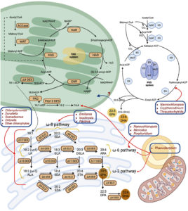 The fatty acyl chain extension requires double bond insertion with the help of dehydratase-isomerase module in the anaerobic polyketide synthase pathway. The aerobic desaturase/elongase pathway is distinct and needs oxygen-dependent desaturation steps for the elongation of the fatty acyl chain and insertion of double bonds.4 In Thraustochytrium and Schizochytrium, the existence of both systems has been reported. The Schizochytrium is known to lack Δ12-desaturase activity in their aerobic desaturase/elongase system and is not competent to utilize FAS (fatty acid synthase) products for long-chain polyunsaturated fatty acids (LCPUFAs) (long-chain polyunsaturated fatty acids) long-chain fatty acid synthesis. Gene involved in desaturases has been recognized in anerobic and aerobic pathways of Thraustochytrium and Schizochytrium. The findings demonstrated the presence of an incomplete elongase/desaturase system in Schizochytrium sp. Thraustochytrium possesses Δ12-desaturase, which produces long-chain polyunsaturated fatty acids (LCPUFAs) through the desaturase/elongase and polyketide synthase pathways.4 Thus, microbes have either aerobic desaturase/elongase or anaerobic polyketide synthase pathway and in some cases both the systems for the synthesis of fatty acid.