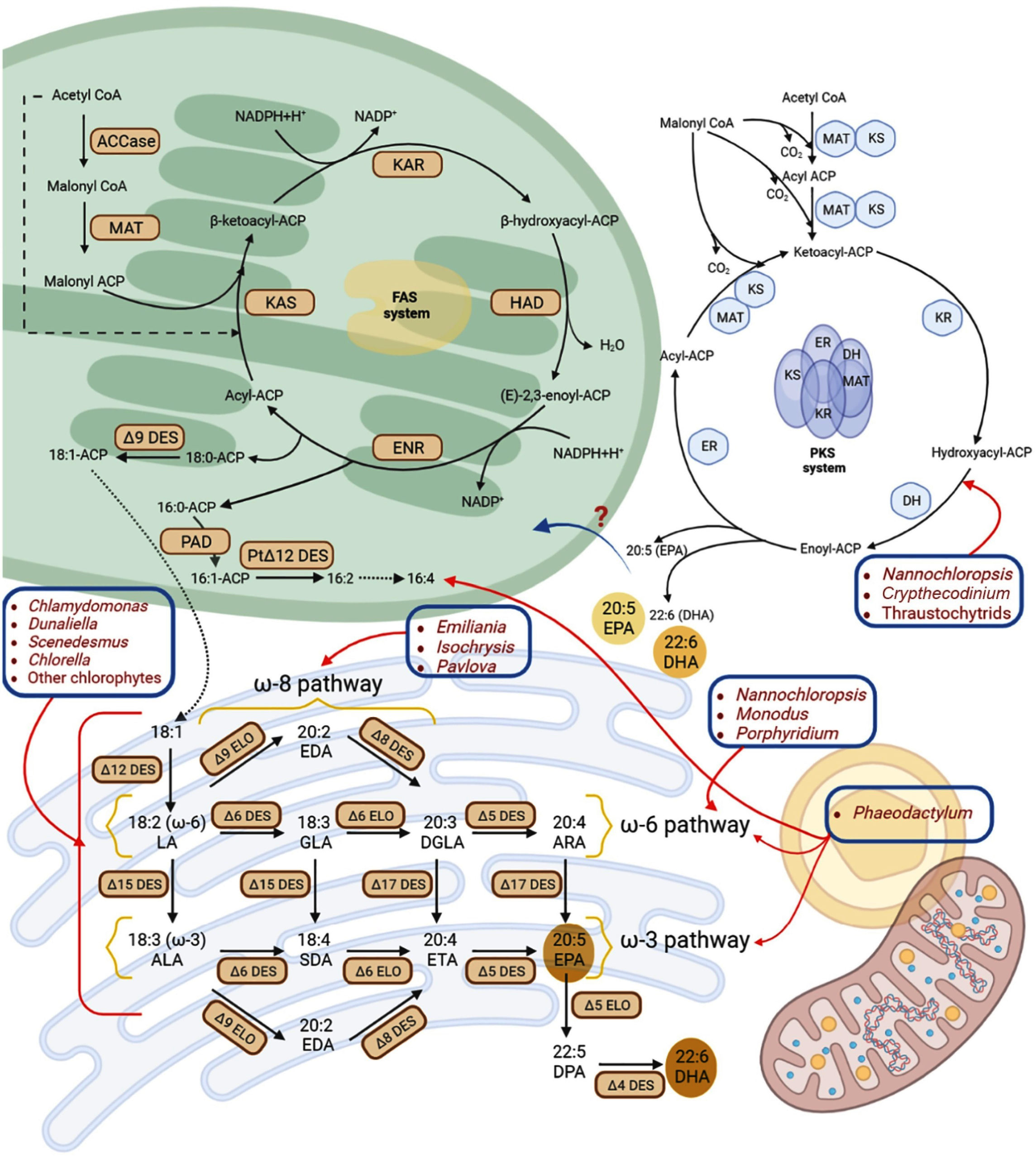 Figure. Pathways of ω (omega)-fatty acid biosynthesis in microorganisms.106 In microalgae, saturated (C16:0) and monounsaturated (C18:1) fatty acids are initially produced within chloroplast and subsequently transported to endoplasmic reticulum, where further desaturation and elongation occur. The specific desaturation and elongation pathways-namely omega-3, omega-6, or omega-8 differ among species. Additionally, certain microalgae possess a cytoplasmic PKS (polyketide synthase) pathway capable of synthesizing DHA and EPA through iterative chain extension and desaturation. The lines, red in color, highlight the presence of these biosynthetic routes in various algal taxa, blue boxes denote species-specific pathways, dashed arrows represent multi-step enzymatic conversions, and question marks indicate unidentified mechanisms for DHA/EPA incorporation into the endoplasmic reticulum.