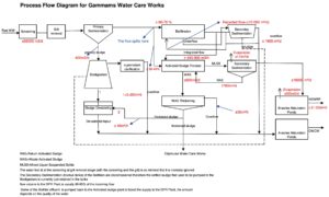Figure 1. Process flow diagram of wastewater treatment plant A showing the main stages of wastewater treatment, including influent, treatment units, and effluent pathways. Arrows indicate the direction of wastewater flow