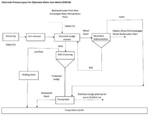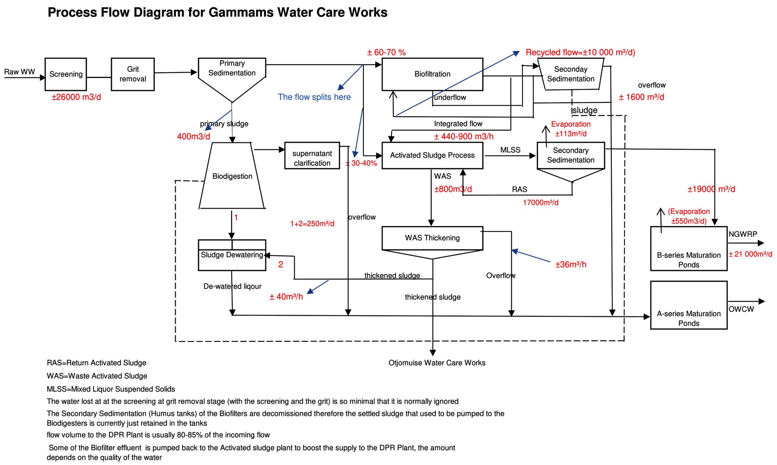 Figure 2. Process flow diagram of wastewater treatment plant B, illustrating the major treatment stages, return activated sludge (RAS), waste activated sludge (WAS), and integration of backwash water from the New Goreangab Water Reclamation Plant. Arrows indicate the direction of wastewater flow