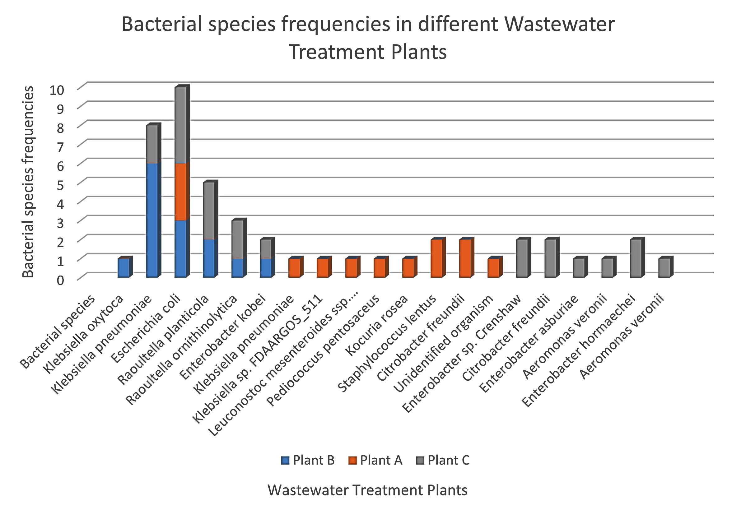 Figure 4. Distribution of bacterial species across the three wastewater treatment plants. Significant variation was observed among sites (c² = 45.87, df = 4, p < 0.0001), with Escherichia coli being most prevalent and Plant A showing the highest diversity
