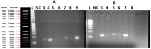 (B) Lane 1: 1 Kb DNA ladder; NC: negative control; Lanes 3-8: bacterial samples. No amplification detected in any sample, indicating the absence of the gyrA gene
