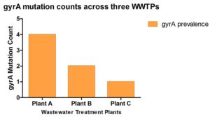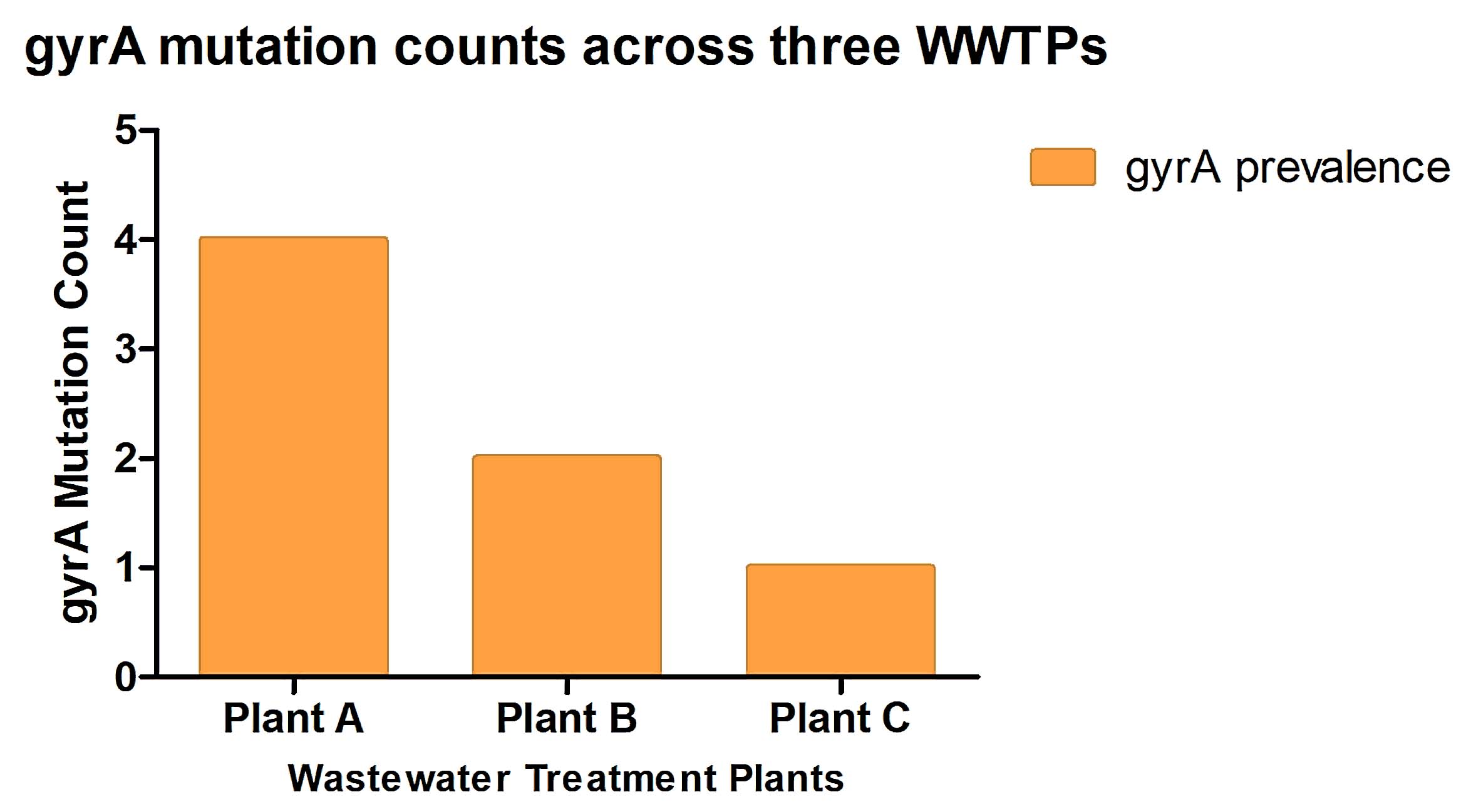Figure 7. Prevalence of gyrA mutations among bacterial isolates from three wastewater treatment plants (Plants A, B, and C). Plant A exhibited the highest mutation prevalence, followed by Plant B and Plant C