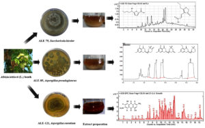 Both Internal Transcribed Sequence (ITS) analysis and morphological assessment were conducted to characterize the isolated endophytic fungi, as nucleotide-to-nucleotide BLAST query revealed ALE-75, as Sacharicola bicolor, ALE-85, as Aspergillus pseudoglaucus, and ALE-121, identified as Aspergillus eurotium as its closest match.