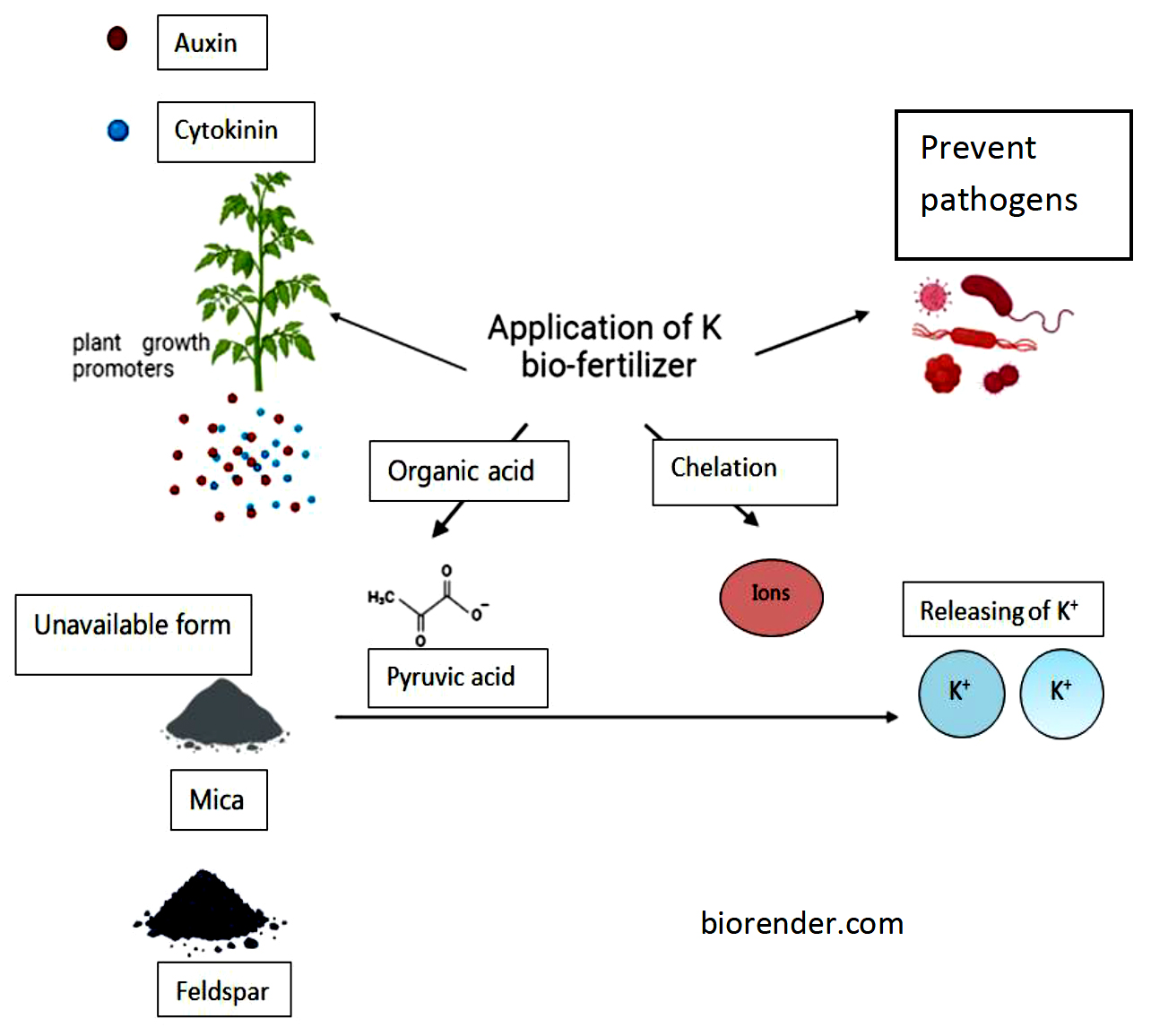 Figure 1. The above image illustrates the mechanism of application of potassium (K) biofertilizer in plant growth and nutrient availability. Application of K bio-fertilizer enhances plant growth by producing plant growth promoters such as auxin and cytokinin, and by preventing pathogenic infections. Microbial activity leads to the secretion of organic acids (e.g., pyruvic acid) and chelating agents that solubilize unavailable forms of potassium present in minerals such as mica and feldspar. This process releases K⁺ ions into the soil, making potassium available for plant uptake and improving overall nutrient assimilation and health