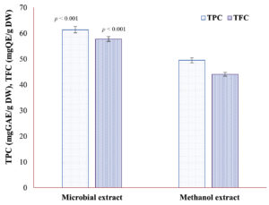 Figure 1. Total phenolic content and total flavonoid content of microbial and methanol extracts of defatted biomass of N. pupukensis DMA5