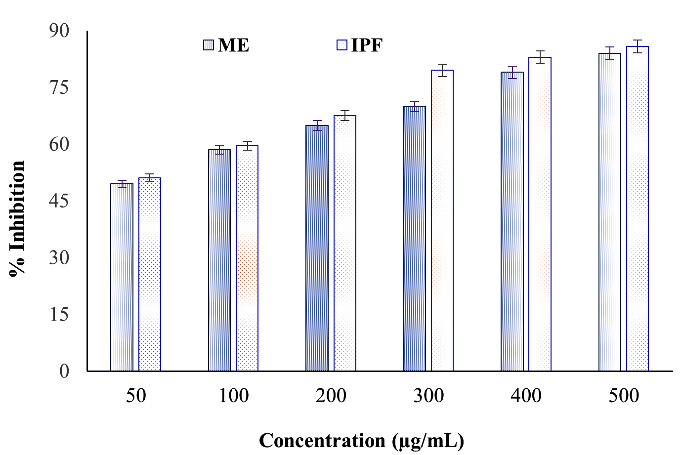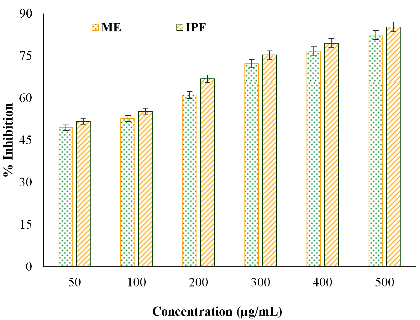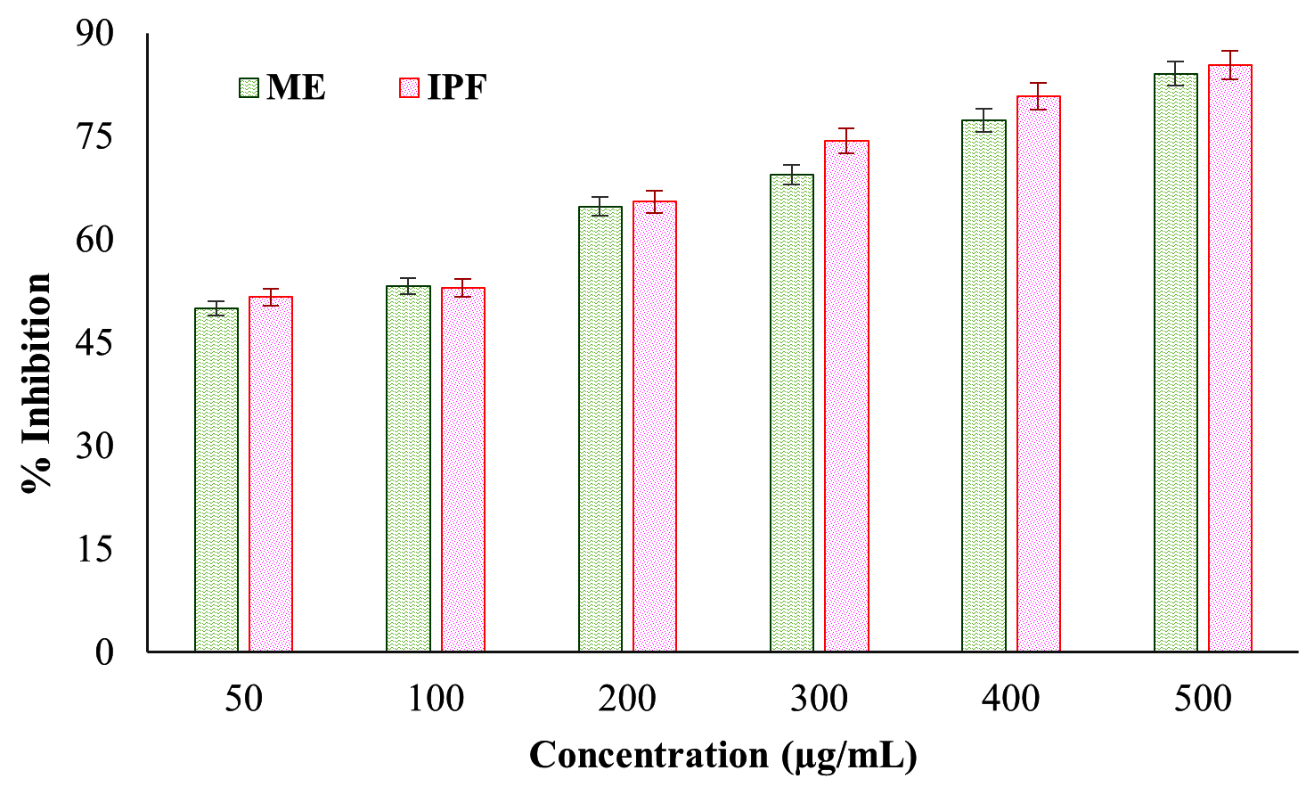The in vitro anti-proteinase activity of the ME derived from N. pupukensis DMA5 was evaluated in comparison with IPF as the standard drug. The results presented in Figure 3, show that both the ME and IPF displayed concentration-dependent inhibition of proteinase activity. The ME showed inhibition values extending from 49.51% at 50 µg/mL to 82.45% at 500 µg/mL, whereas IPF showed slightly higher inhibition, from 51.77% to 85.34%. Statistical analysis by a paired t-test (t = -6.20, p = 0.0016) confirmed a significant variance (p < 0.01) among the ME and IPF, indicating that while both samples effectively inhibited proteinase activity, the standard drug remained marginally more potent. However, at higher concentrations (≥400 µg/mL), the inhibition levels of the ME approached those of IPF, suggesting strong dose-dependent anti-inflammatory efficacy.