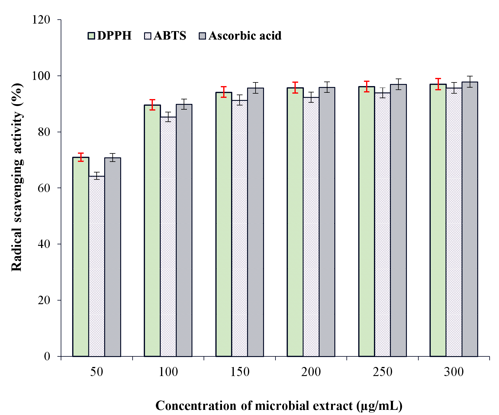 The in vitro antioxidant potential of ME of DB of N. pupukensis DMA5 was evaluated using DPPH and ABTS assays across concentrations of 50-300 µg/mL (Figure 5) and compared with ascorbic acid as the standard antioxidant. A progressive, concentration-dependent enhancement in radical scavenging activity was observed in both assays. For the DPPH assay, scavenging activity increased from 70.97% at 50 µg/mL to 97.04% at 300 µg/mL. Likewise, the ABTS assay showed an increase in radical scavenging activity from 64.32%-95.71% at 50 and 300 µg/mL, respectively. However, DPPH assay consistently showed slightly higher values than ABTS. At concentrations ranging from 150-300 µg/mL, the ME exhibited strong antioxidant performance, with DPPH scavenging values ranging from approximately 94%-98% and ABTS values between 92%-97%. Over the same concentration range, ascorbic acid also showed consistently high inhibition levels of about 96%-98%. At these elevated concentrations, the antioxidant activity of the ME closely matched that of the standard, with only a minimal difference of around 1%-3%, indicating comparable radical scavenging efficiency. The IC50 values determined through regression analysis were 41.6 µg/mL for DPPH and 46.8 µg/mL for ABTS, indicating a strong antioxidant potential. These findings support the potential of ME derived from DB of N. pupukensis DMA5 as natural antioxidants.