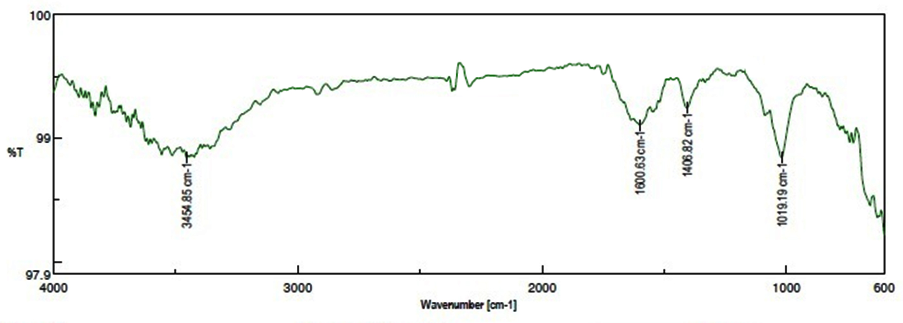 The FTIR spectrum of the ME derived from DB of N. pupukensis DMA5 revealed four prominent absorption peaks, indicating the occurrence of diverse functional groups related with bioactive metabolites (Figure 6). An intense and broad absorption band appearing at 3454.85 cm-1 corresponded to O-H stretching vibrations of hydroxyl groups, indicative of the presence of phenolic and flavonoid compounds. Another strong peak appeared at 1600.53 cm-1, attributed to C=O stretching of conjugated carbonyl or amide groups, suggesting the presence of proteins, esters, and polyphenolic compounds generated during microbial fermentation.