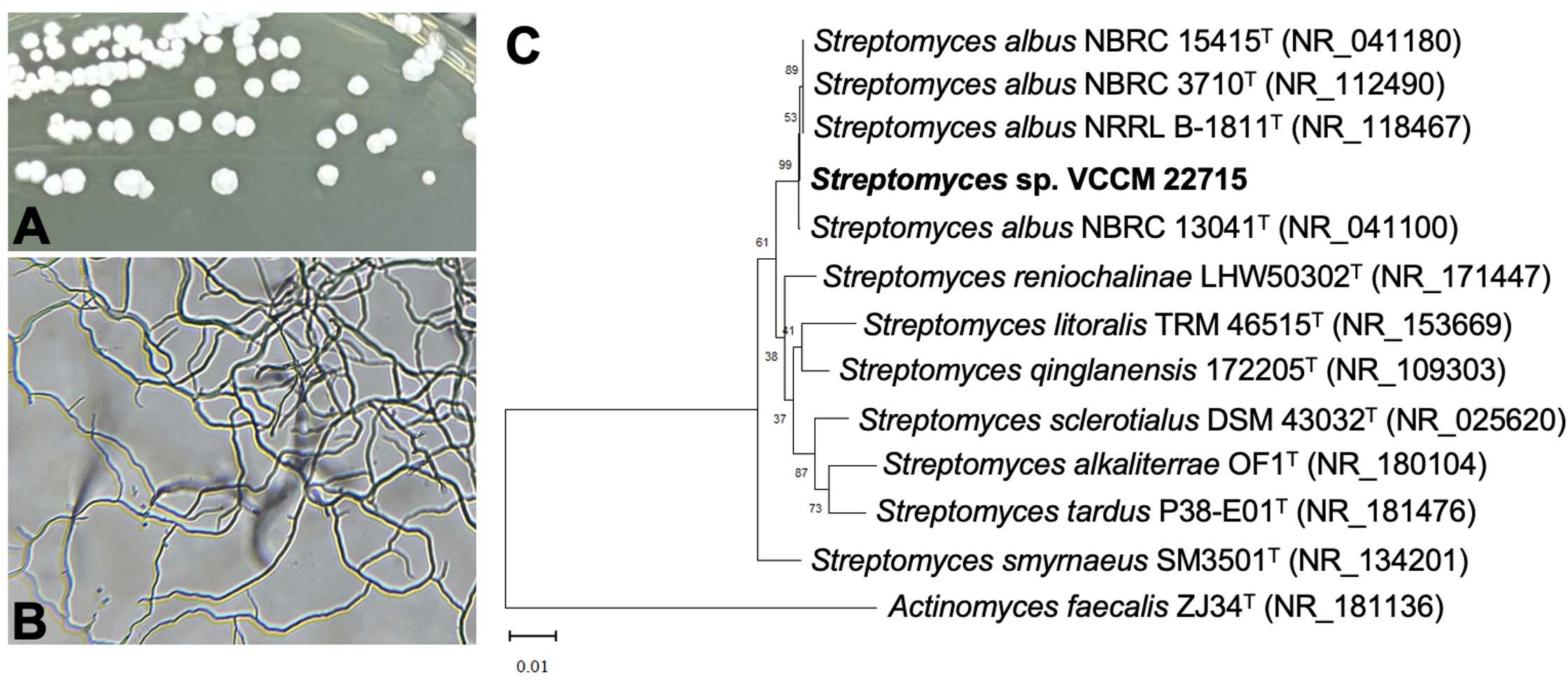 Figure 1. Identification of the strain VCCM 22715. Colonies grown on ISP2 agar plate (A) and aerial hyphae under phase contrast microscopy (B) of the strain VCCM 22715. (C) Phylogenetic tree built from 16S rRNA sequence of the VCCM 22715 and its related type strains