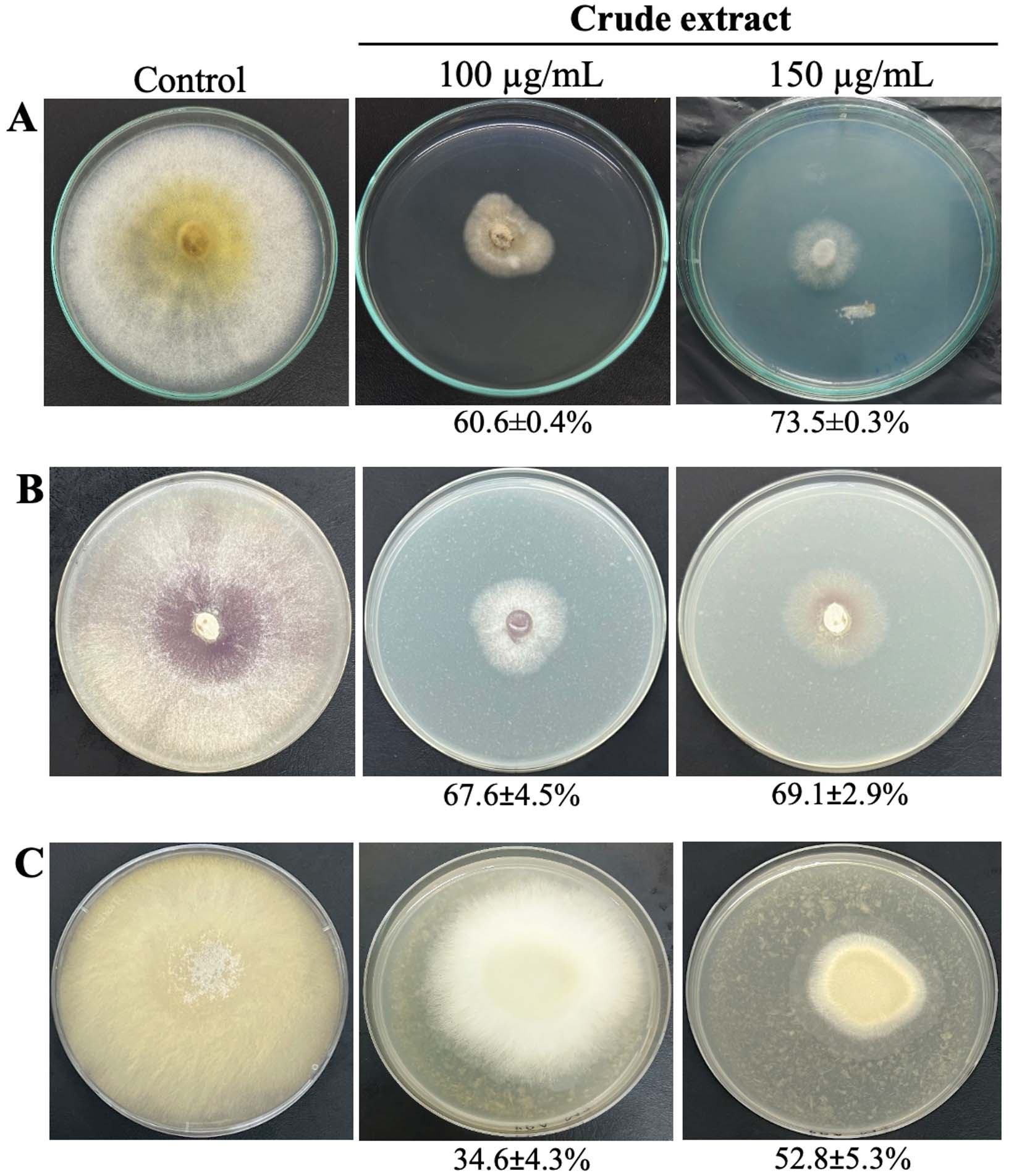 Figure 2. Antifungal activity of the VCCM 22715 extract against Magnaporthe oryzae (A), Fusarium solani (B), and Rhizoctonia solani (C)