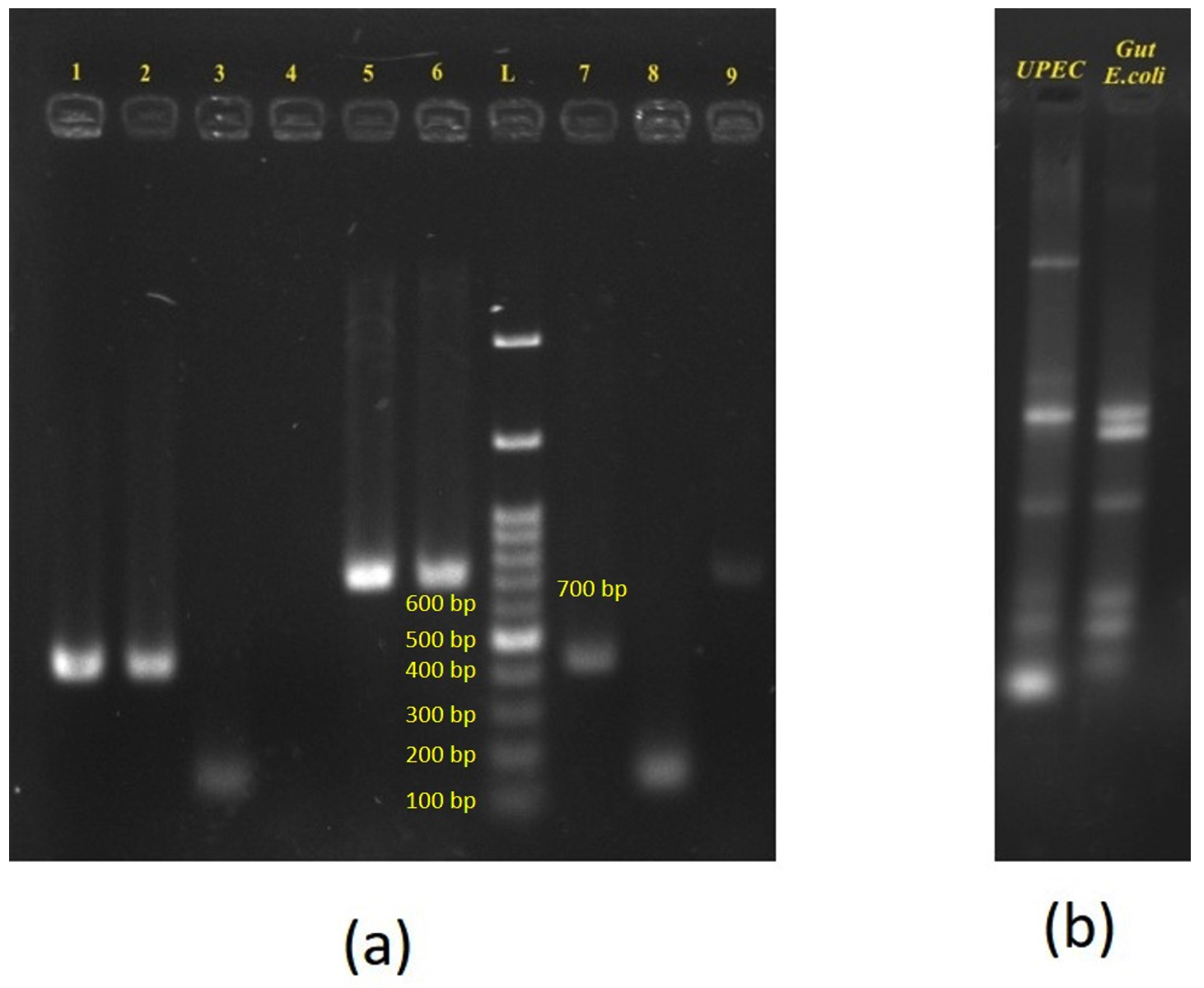 (b): ERIC PCR profile of UPEC and Gut E. coli – showing dissimilar banding patterns