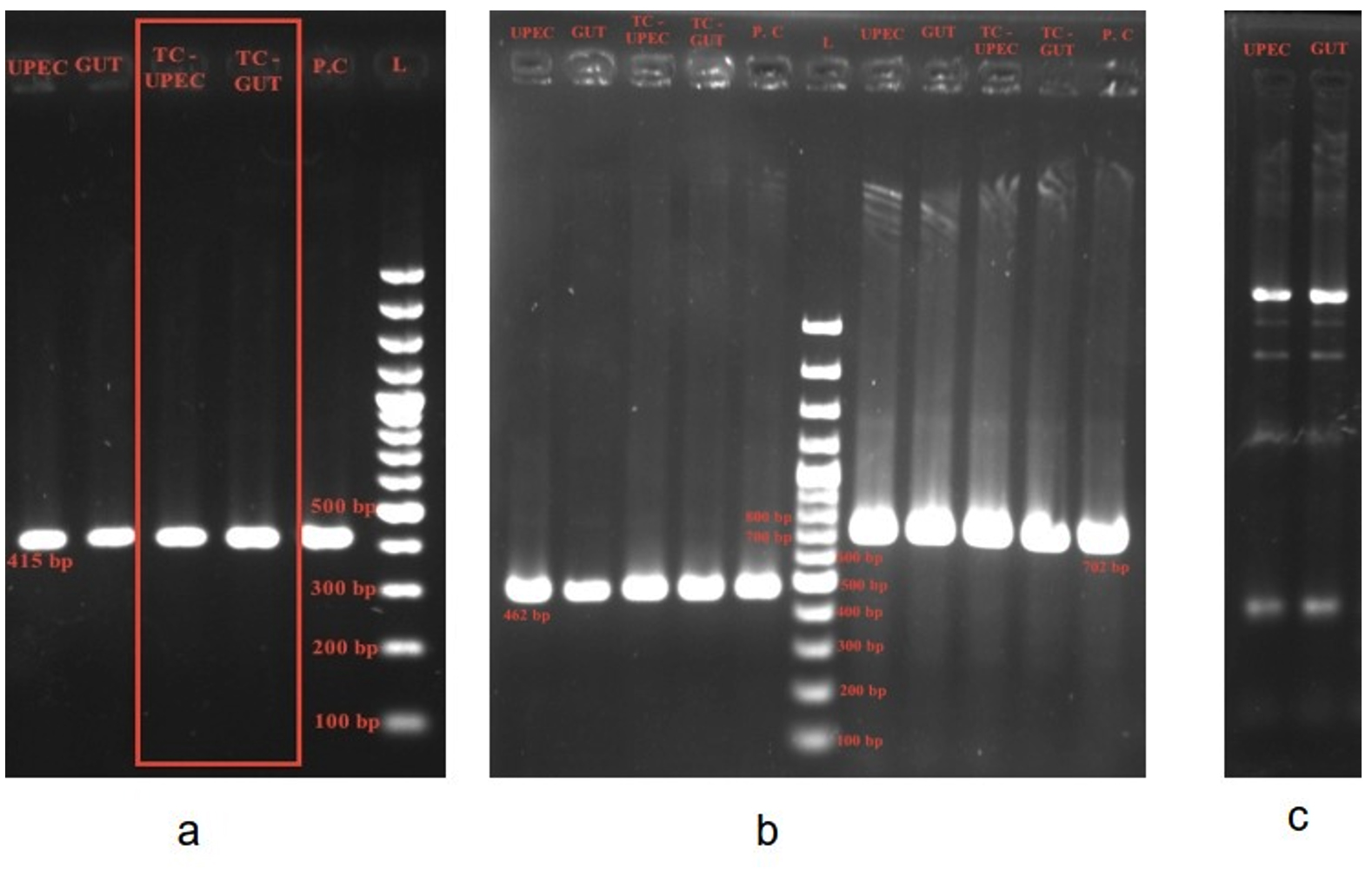 (a): blaCTX-M group 1 – 415 bp present in: UPEC, Gut E. coli, TC-UPEC, TC Gut- Transconjugant Gut E. coli, PC – Positive control, L- ladder 100 bp – 1.5 Kb