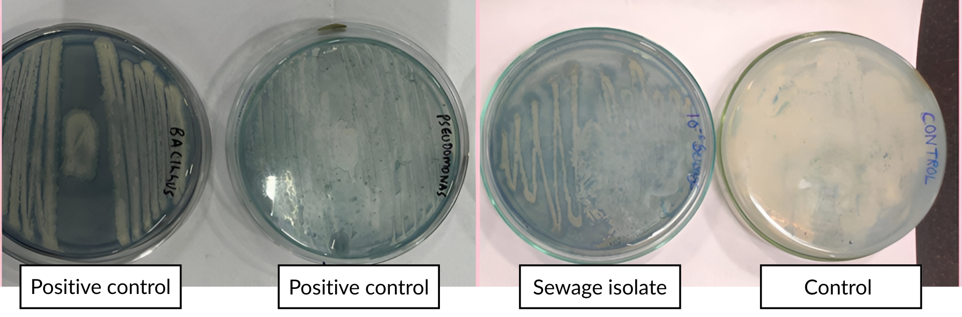Figure 2. Sudan Black plate assay showing bluish black colonies in the isolate and positive controls