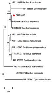 The PHB-producing isolate was cultured separately and taken for identification. Before its identification, the isolate of the smear was made on a microscopic slide and stained with Sudan black B dye to confirm PHB production, where PHB granules present inside the cytoplasm were stained blue-black, confirming PHB production in the isolate.40 Sudan black plate assays were also done in the isolate, positive, and negative control plates, as seen in Figure 2. Sudan black B plate assay was conducted similar to the work of Lathwal et al., and Susianingsih et al.,28,41 which involved incubation of the culture plates with Sudan Black B stain and subsequent rinsing with alcohol, thereby producing bluish black colonies if the strain produces PHB, which was complementary to the results obtained (positive result with bluish black colonies). The isolate identification was done by identifying the morphological characterization of the bacteria by traditional Gram staining. Gram staining revealed the bacteria as Gram-positive rod-shaped bacteria. This was subsequently followed up with 16S rRNA sequencing, and the bacterial strain was found to be Bacillus tequilensis, confirmed by BLAST analysis of a 99% match with the isolate sequence. The phylogenetic relationships were established with the Neighbor-Joining approach,42 and the most suitable tree configuration is presented. Bootstrap values, derived from 500 replicates, are displayed above the branches to signify the confidence level in the taxonomic categorization.43 The tree is proportional, with branch lengths reflecting evolutionary distances. Using the Maximum Composite Likelihood method,44 these distances were calculated as the number of substitutions per site. Thirteen nucleotide sequences were included in this analysis. Ambiguous sites were excluded through pairwise deletion. A total of 1,342 nucleotide positions were aligned to the final alignment. All evolutionary studies were conducted utilizing the MEGA11 software45 (Figure 3).