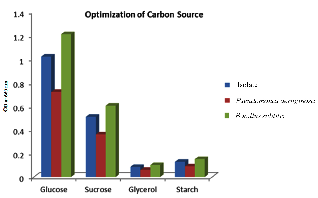 Carbon and nitrogen derived from various types were studied to optimize the minimal media for the isolate- Bacillus tequilensis, while simultaneously comparing with optimization done in the two positive controls. Prior research has established that the choice of carbon source exerts a significant influence on PHB yield. These findings, depicted in Figure 4, showcase the impact of the various carbon sources, like glucose, sucrose, glycerol, and starch, on the production of PHB. These results underscore the variability in the ability of bacteria to utilize different carbon sources, a characteristic dependent on multiple factors. Specifically, the investigation revealed that glucose stands as the most favorable carbon source for promoting PHB yield, with sucrose and starch following as relatively effective options. This suggests that monosaccharides such as glucose are readily metabolized by bacteria, thereby enhancing the production of PHB, whereas a complex molecule, such as starch, on the other hand, poses a significant challenge for the production of PHB.