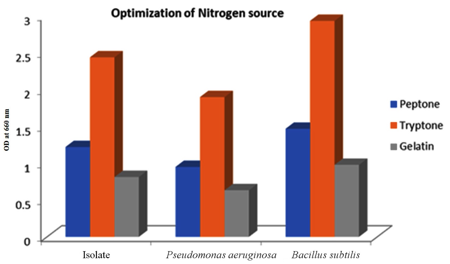 Following the carbon source optimization, the medium containing the optimal carbon source was added with various nitrogen sources, such as tryptone, peptone, and gelatin, at a concentration of 1%. The cultures were incubated for 48 hours in a rotary shaker at 30 °C, followed by quantification to select the optimal nitrogen source for high PHB yield.33