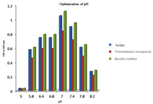 Optimization of pH is done by culturing the isolate in minimal media containing the optimal carbon and nitrogen source at various pH levels of 5, 5.8, 6.4, 6.8, 7, 7.4, 7.8, and 8.2. The culture media were incubated for 48 hours in a shaker incubator, followed by the quantification of PHB yield using a UV spectrophotometer.28