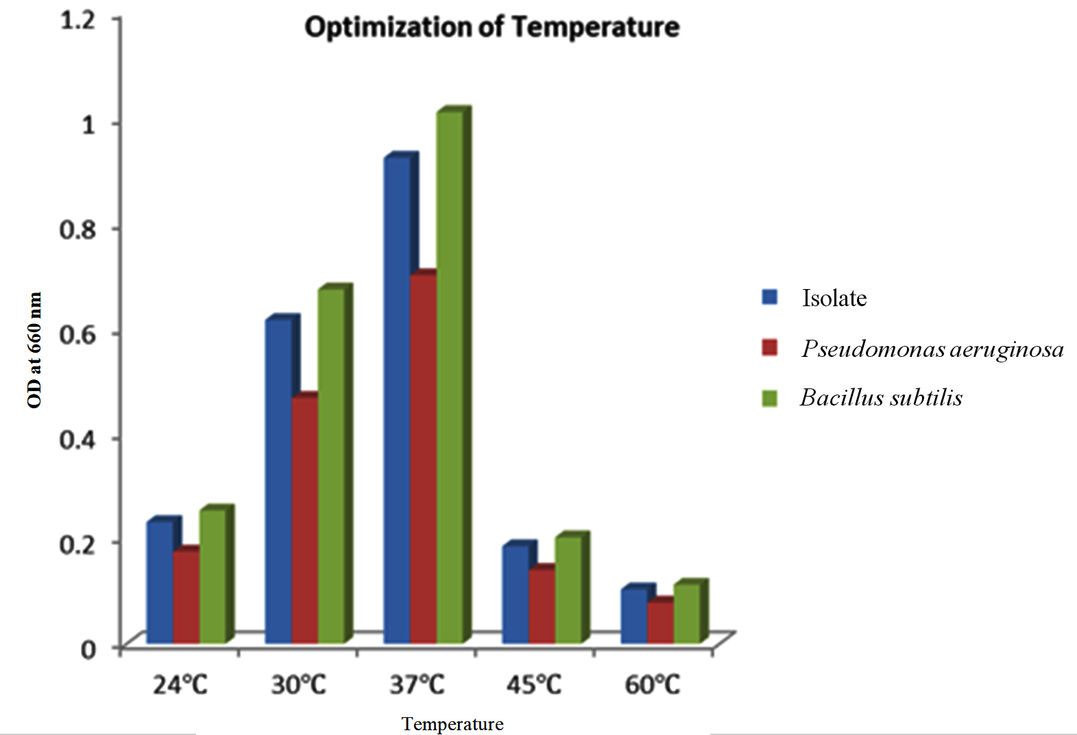The isolate, along with the two positive controls, were subject to varied temperature incubations 24 °C, 30 °C, 37 °C, 45 °C and 60 °C after the media and pH optimization. The highest quantity of PHB was produced at 37 °C, after which there is a decline in PHB production as seen in Figure 7. It may be due to the fact that the enzyme that is responsible for PHB synthesis may be more active at mesophilic temperatures than at extreme temperatures, resulting in diminished enzyme and protein function.46