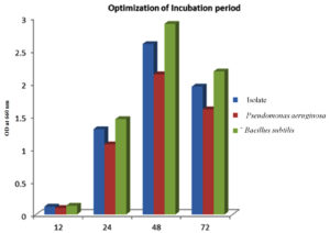 The isolate, along with the controls, was cultivated in the optimized media enriched with glucose, tryptone with a pH of 7 at 37 °C for various durations, specifically 12, 24, 48, and 72 hours. It was observed that the PHB yields exhibited a time-dependent increase, with the highest yield achieved after 48 hours of growth.47 The optimal incubation duration for PHB yield was determined to be 48 hours, post which the yield decreases, as seen in Figure 8.