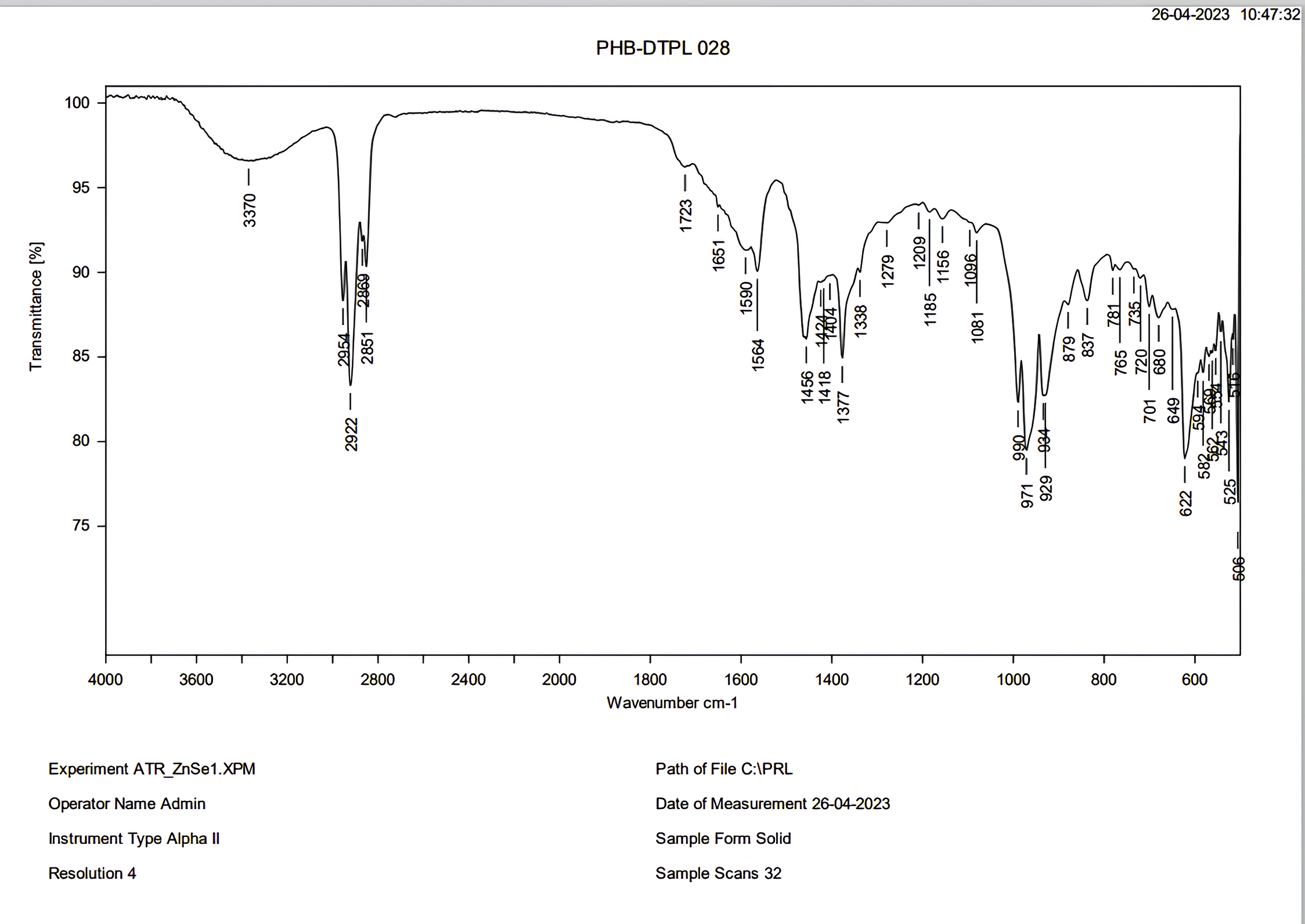 Functional/chemical groups like CH3, CH2, C=O, OH, are considered crucial molecules that decide the presence of PHB, and advanced spectroscopic techniques like FTIR (Fourier transform infrared spectroscopy) can provide a means for characterizing these molecules. One milligram of extracted PHB was dissolved in chloroform, and the chloroform-pellet mixture was thoroughly mixed with potassium bromide (KBr). This was followed by drying at 100 °C for approximately four hours. The FT-IR spectra were recorded between 4000 and 600 cm-1 using a Spectrum 65 FT-IR.37,38