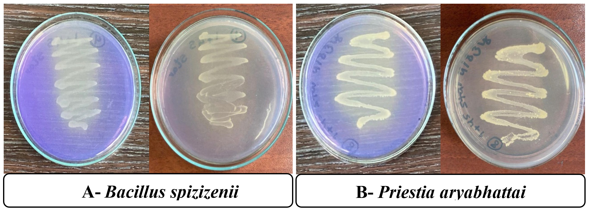 Figure 1. Bromocresol purple test for pH on thiosulfate media for (A) Bacillus spizizenii and (B) Priestia aryabhattai