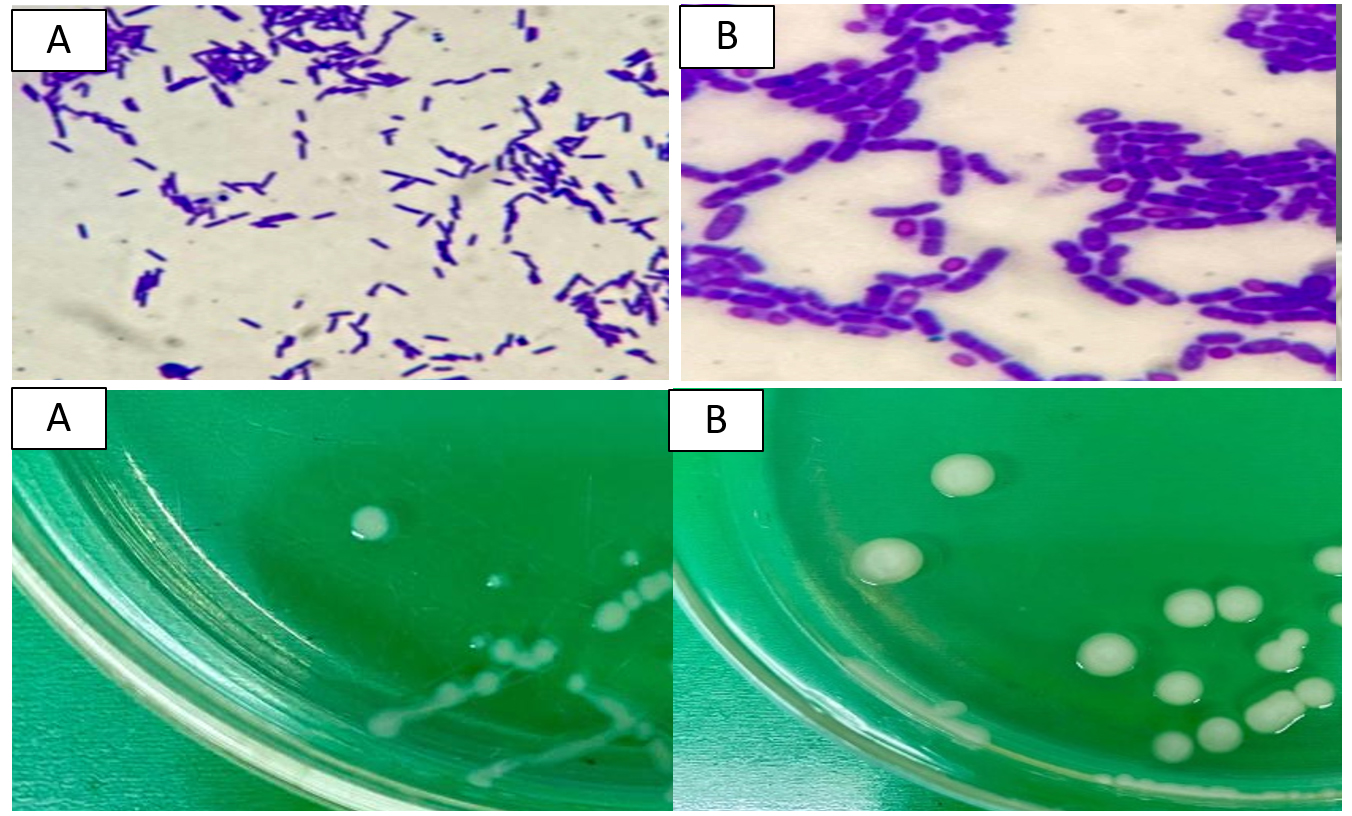 Figure 3. Morphological characteristics of cells and colonies of (A) Bacillus spizizenii and (B) Priestia aryabhattai