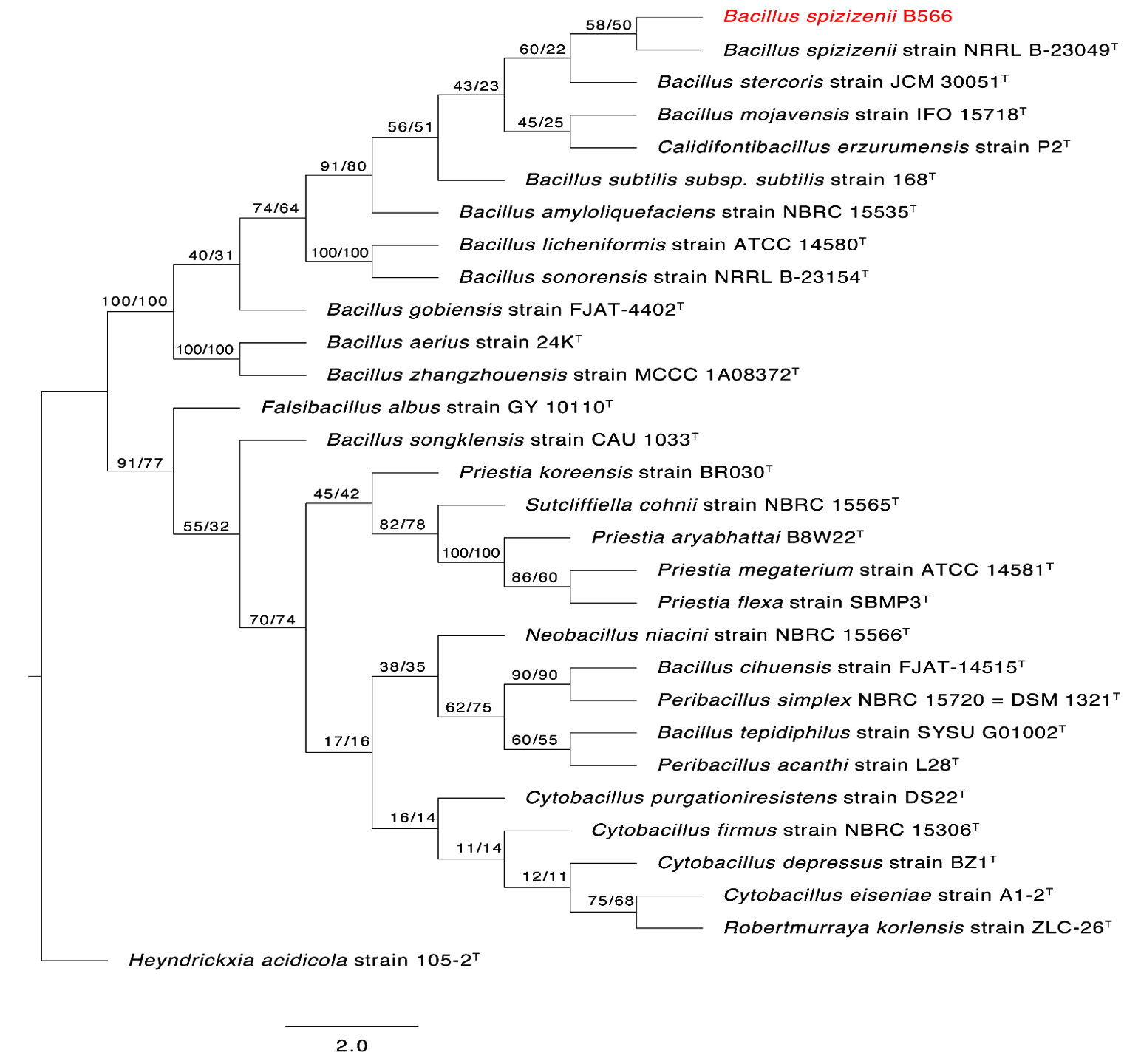 Figure 4. The first of 1000 equally most parsimonious trees obtained from a heuristic search (1000 replications) of Bacillus spizizenii strain B566 (in red color) compared to other closely similar 16S rRNA sequences in GenBank. Bootstrap support values for ML/MP are indicated above/below the respective nodes. Type strains are indicated with T. The tree is rooted to Heyndrickxia acidicola strain 105-2 as outgroup