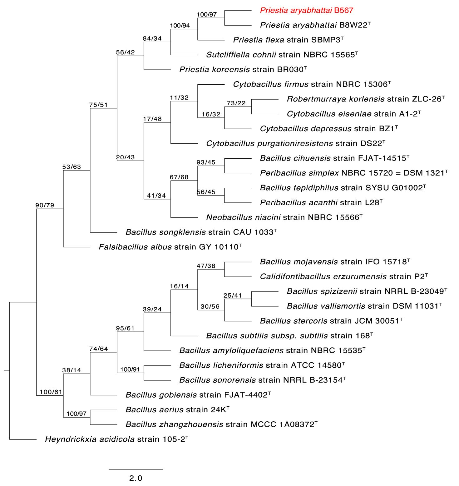 Figure 5. The first of 1000 equally most parsimonious trees obtained from a heuristic search (1000 replications) of Priestia aryabhattai strain B567 (in red color) compared to other closely similar 16S rRNA sequences in GenBank. Bootstrap support values for ML/MP are indicated above/below the respective nodes. Type strains are indicated with T. The tree is rooted to Heyndrickxia acidicola strain 105-2T as outgroup