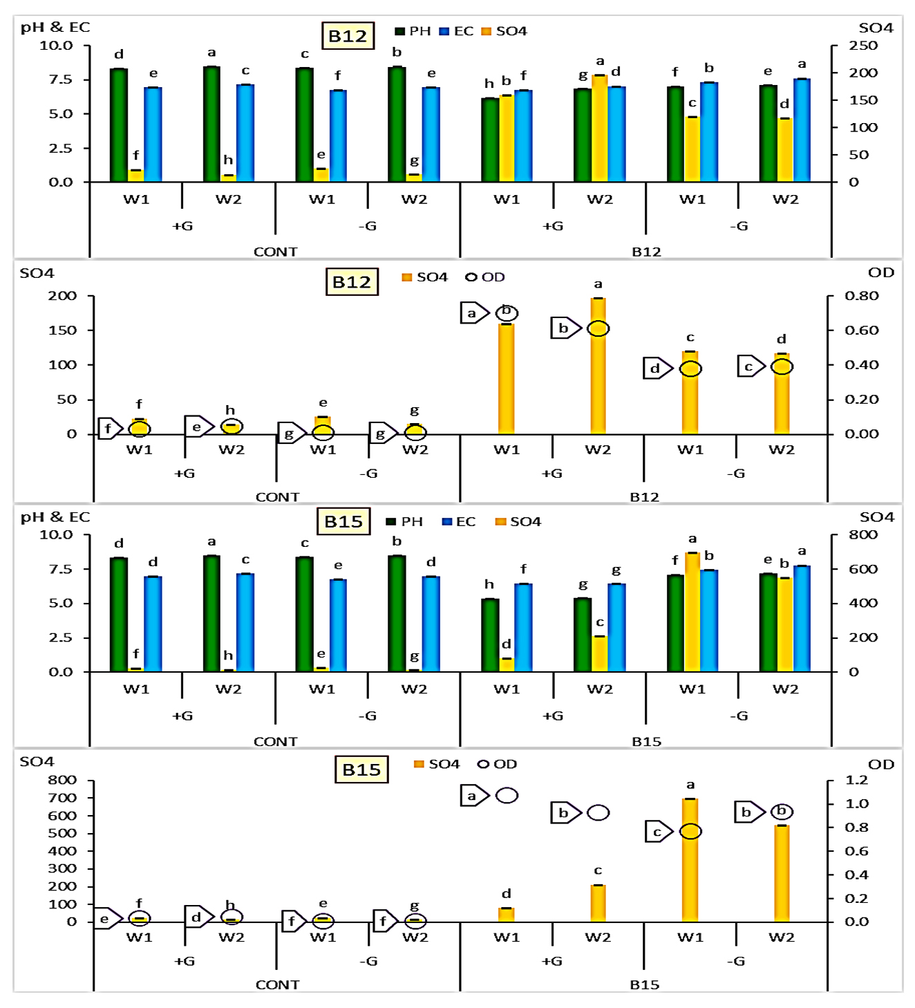 Figure 6. B12 and B15 grown with (+G)/without (-G) glucose amendment achieving sulfur oxidation after 1 and 2 weeks with recorded variations in final pH, EC and OD values compared to control individually. [LSD values for pH, EC, SO4 and OD were 0.0208, 0.0138, 0.0140 and 0.0055 under B12, while were 0.0194, 0.0162, 0.0162 and 0.0126 under B15, respectively]
