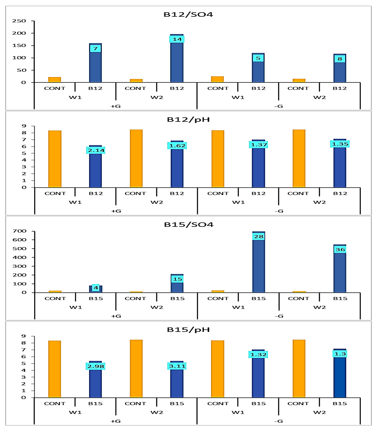 According to data illustrated in Figure 6 and emphasized in Figure 7, SO42- concentration increased under B12 by 14-fold and 8-fold in the second week compared to the control with and without glucose, while pH decreased 1.6 units and 1.4 units, respectively. On the other hand, under B15, sulphate concentration increased by 15-fold and 36-fold in the second week compared to the control with and without glucose, while pH decreased 3.1 units and 1.3 units, respectively.