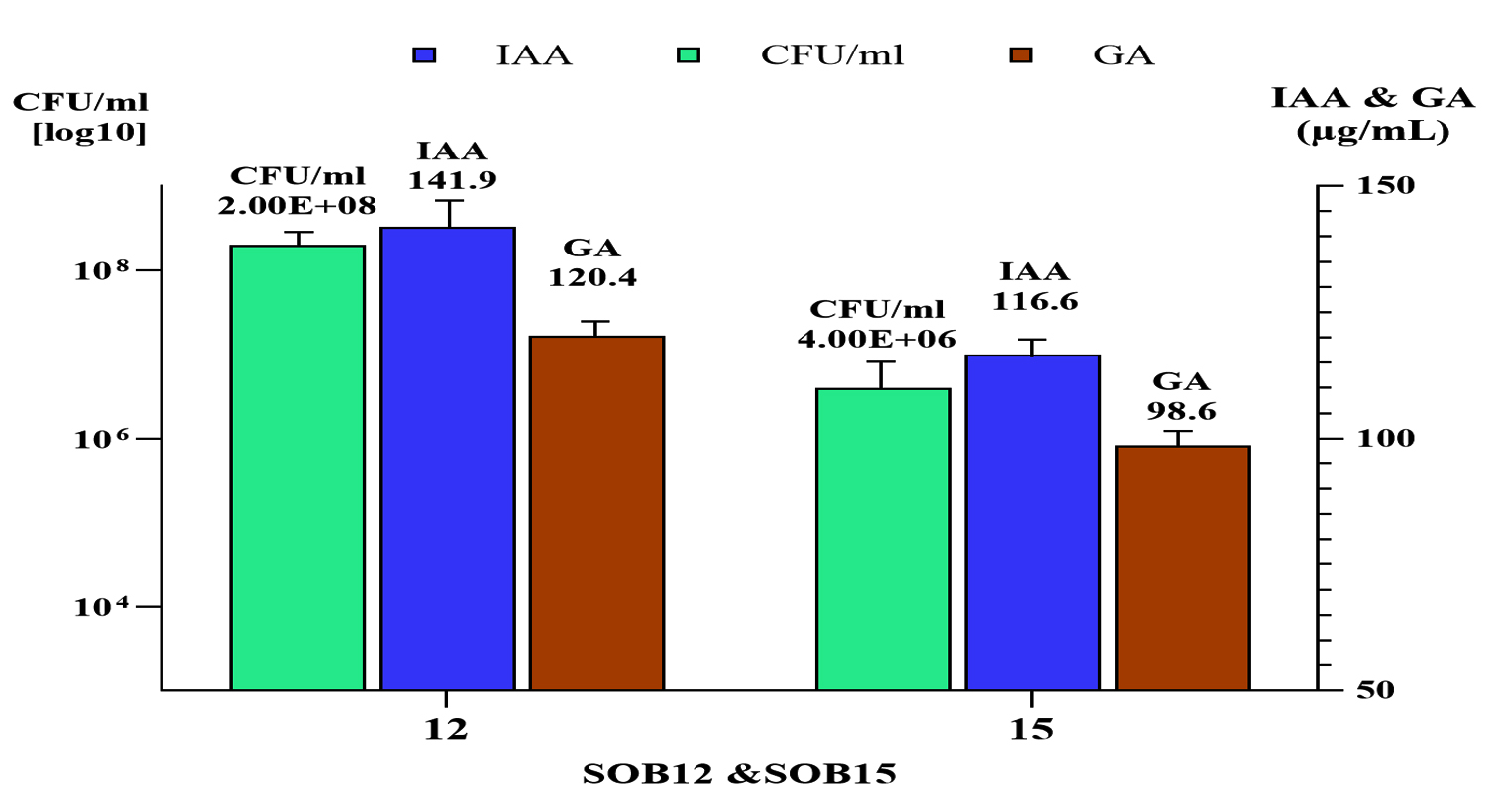 When Bacillus and Priestia were cultivated in nutrient broth supplemented with 0.1 g/L of tryptophan and incubated at 33 ± 2 °C for three days, the concentrations of IAA and GA produced by Bacillus recorded 141.9 µg/mL and 120.4 µg/mL, respectively, at a population density of 2.0 log CFU/ml in Figure 8.
